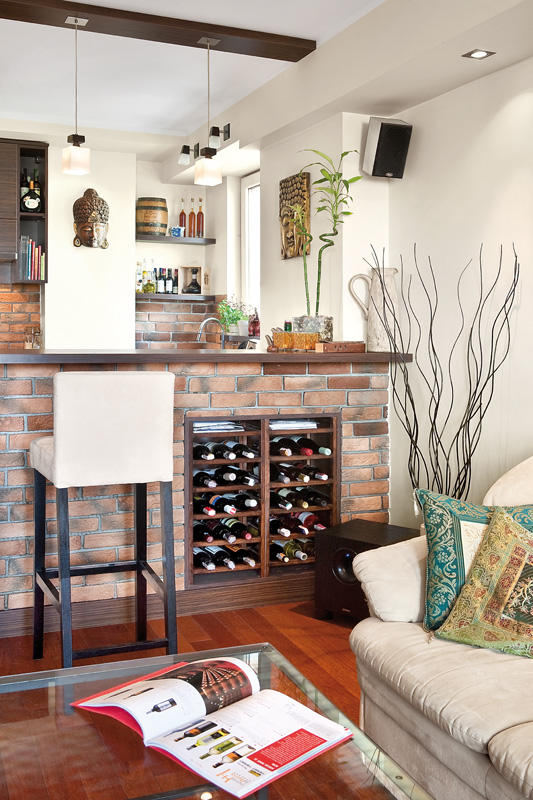Biorąc pod uwagę metraż, mieszkanie pana Olafa nie jest duże, ale jest tak konsekwentnie urządzone, że w pełni odpowiada codziennym potrzebom domowników. Pan Olaf wraz ze swoją partnerką, samodzielnie urządzając wnętrze od podstaw, zaledwie w ciągu trzech i pół tygodnia, znaleźli wspólny mianownik dla swoich upodobań. Zależało im przede wszystkim na uzyskaniu spójnego wrażenia całości i zdecydowanie im się to udało. Pan Olaf, pytany o największy sukces aranżacyjny wnętrza, z dumą wskazuje na kuchnię, którą stworzył według własnego projektu. W praktyce okazała się niezwykle wygodna i łatwa w utrzymaniu porządku, co jest jej największym atutem, ponieważ jest otwarta na salon. Wyeksponowane w centralnych częściach mieszkania półki z winami zdradzają pasję pana domu i z powodzeniem zastępują tradycyjne bibeloty, dodając życiu codziennemu więcej smaku.