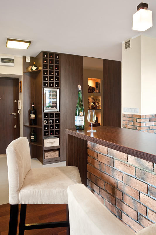 Bardzo wygodny układ poszczególnych stref funkcjonalnych i konsekwentna kolorystyka to wizytówka mieszkania pana Olafa. Nawet najdrobniejszy detal ma tutaj swoje praktyczne uzasadnienie, a zafascynowanie światem win to swoista kropka nad „i”, która decyduje o charakterze tego wnętrza.