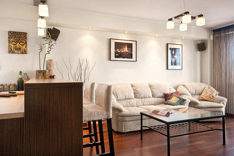 Domownicy mieli dość sprecyzowane oczekiwania. Przystępując do remontu wiedzieli, że chcą uzyskać przede wszystkim wrażenie jasnego mieszkania w ciągu dnia i przytulnego po zmroku. Niewątpliwie cel został osiągnięty. Wszystko za sprawą konsekwentnie zróżnicowanej kolorystyki mebli i ścian, utrzymanej w ciepłej, beżowo-brązowej tonacji.