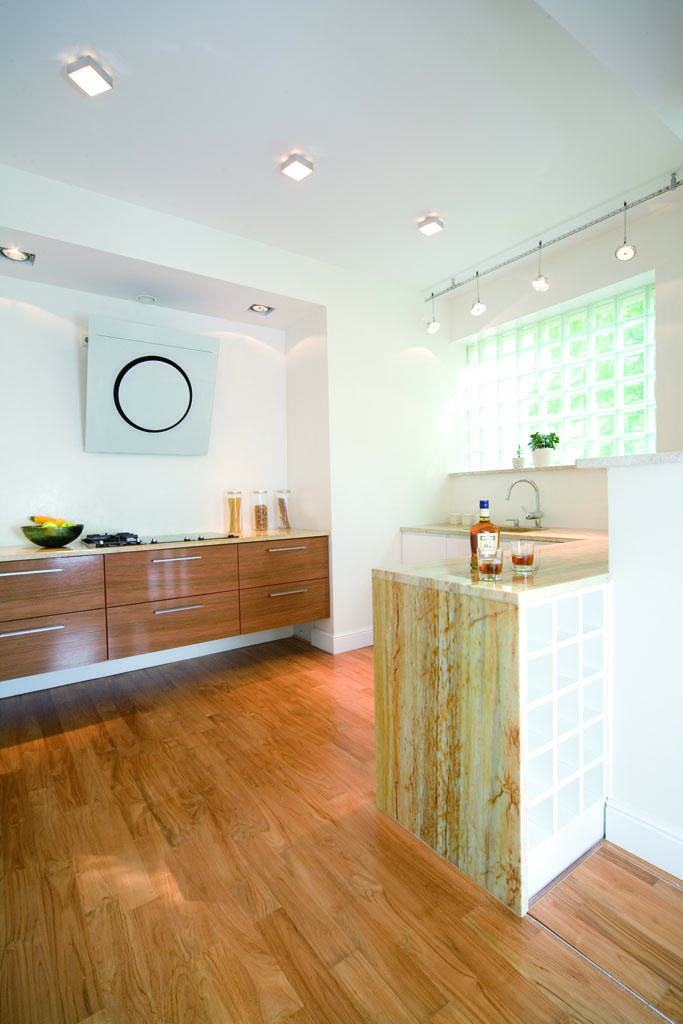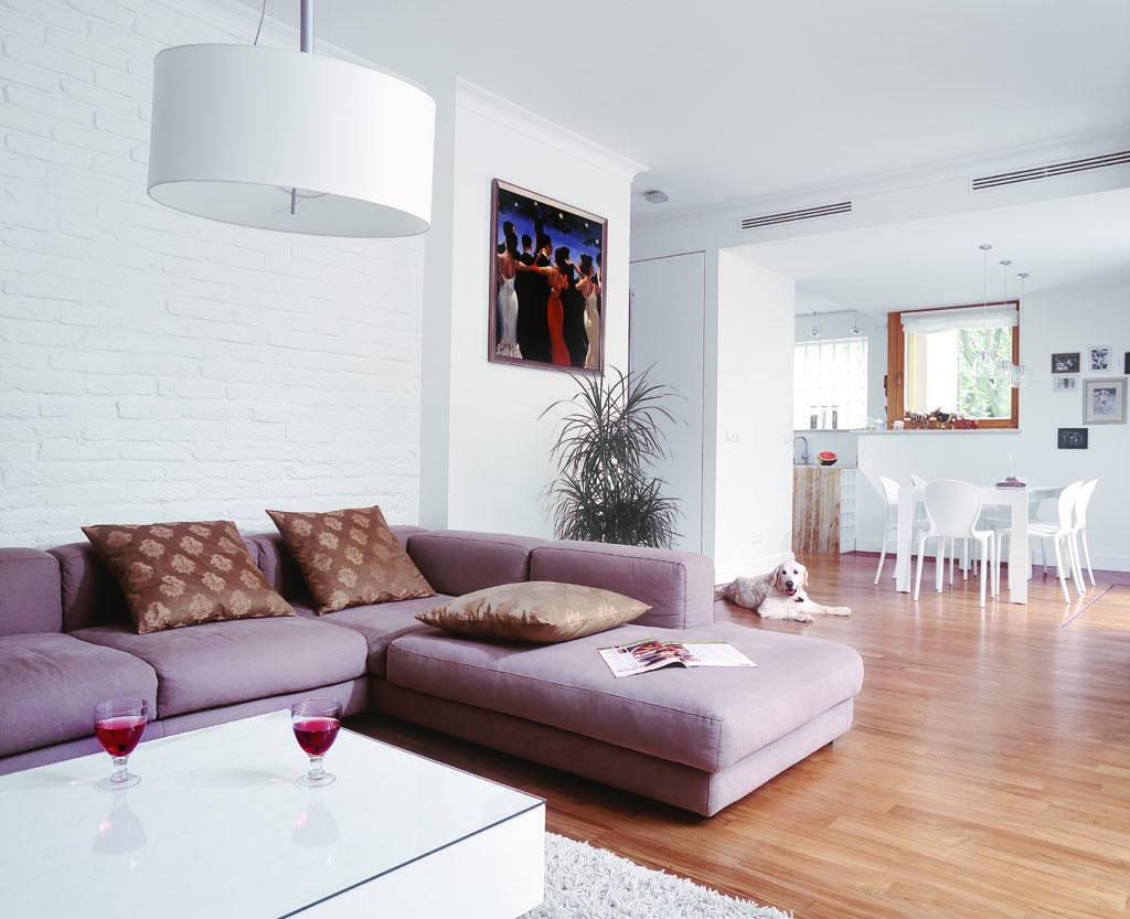 Gospodarze apartamentu są estetami, zaprojektowano je więc ze szczególną dbałością o szczegóły. Grzejniki zostały umieszczone w podłodze. Latem, kiedy są nieużywane, są schowane pod zaślepkami, a zimą ciepło wydobywa się zza drewnianych kratownic. Podłoga w salonie została wykonana z desek – teak indonezyjski. Ścianę w sypialni i salonie dekoruje przedwojenna cegła pochodząca z rozbiórki łódzkiego domu. Włoski narożnik tapicerowany jest bawełnianym materiałem. Stolik kawowy to prosty kubik, płyta mdf lakierowana na wysoki połysk. Na blacie znajduje się tafla szkła zabezpieczająca przed jego porysowaniem. Strefę jadalni i kuchni wyróżnia obniżony sufit, w którym kryje się klimatyzacja. W sypialni ściankę (wezgłowie łożka) oraz podświetlany panel obito ręcznie tkanym jedwabiem. W oknach zawieszono mięsiste, zamszowe zasłony na podbiciu, które nie przepuszczają światła słonecznego, co szczególnie latem pozwala na dłuższy sen.