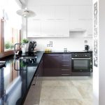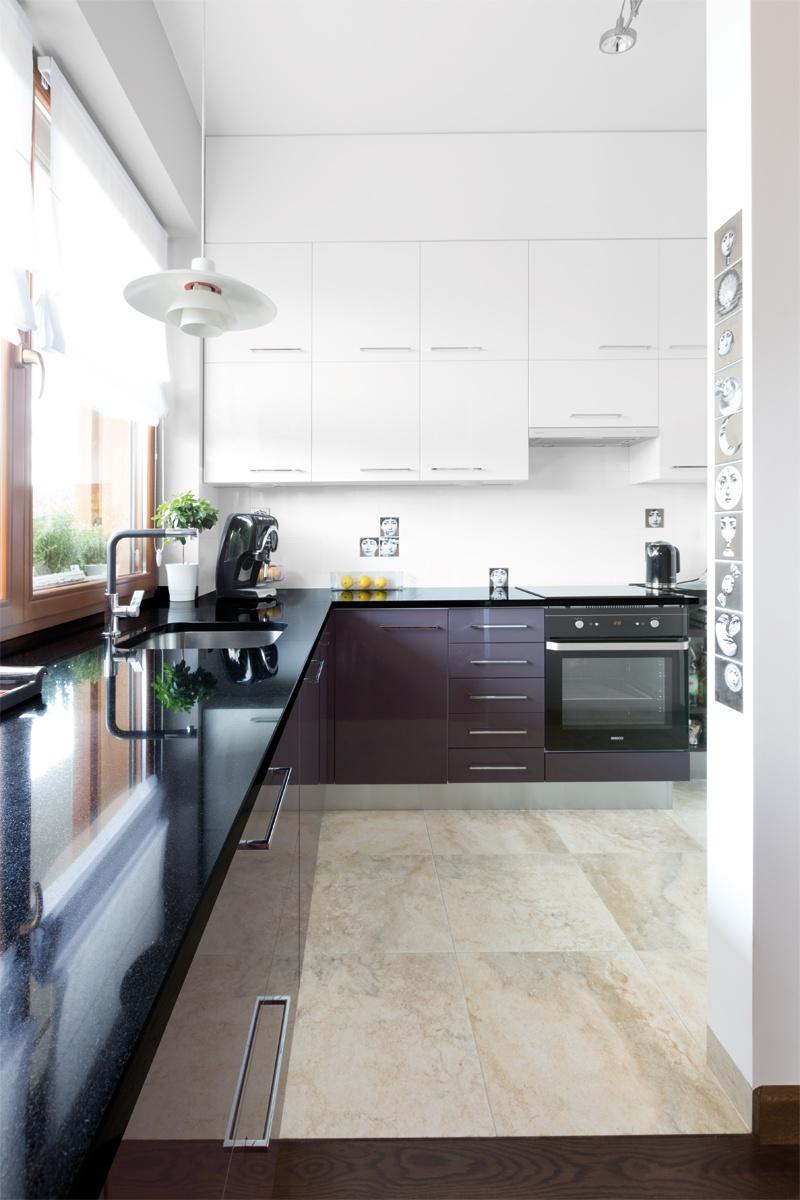 Z racji tego, że kuchnia otwiera się na salon, musiała współgrać z resztą jego wystroju. Tłem dla charakterystycznych płytek są proste białe meble, o równomiernych podziałach, jedynie w dolnej części przełamane nienarzucającym się kolorem, wykończone granitowym blatem. Właściciele zawsze marzyli o zlewie usytuowanym pod oknem, oświetlonym dwiema lampami Poula Henningsena, które kupili na aukcji już kilka lat wcześniej. Z racji ponad trzymetrowej wysokości mieszkania projektantka zasugerowała poprowadzenie zabudowy kuchennej do samego sufitu, co dało mnóstwo dodatkowej przestrzeni do przechowywania.
