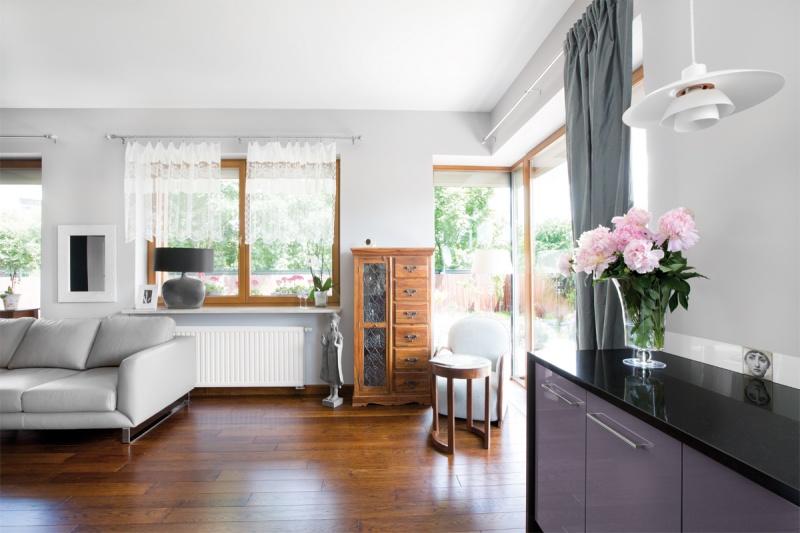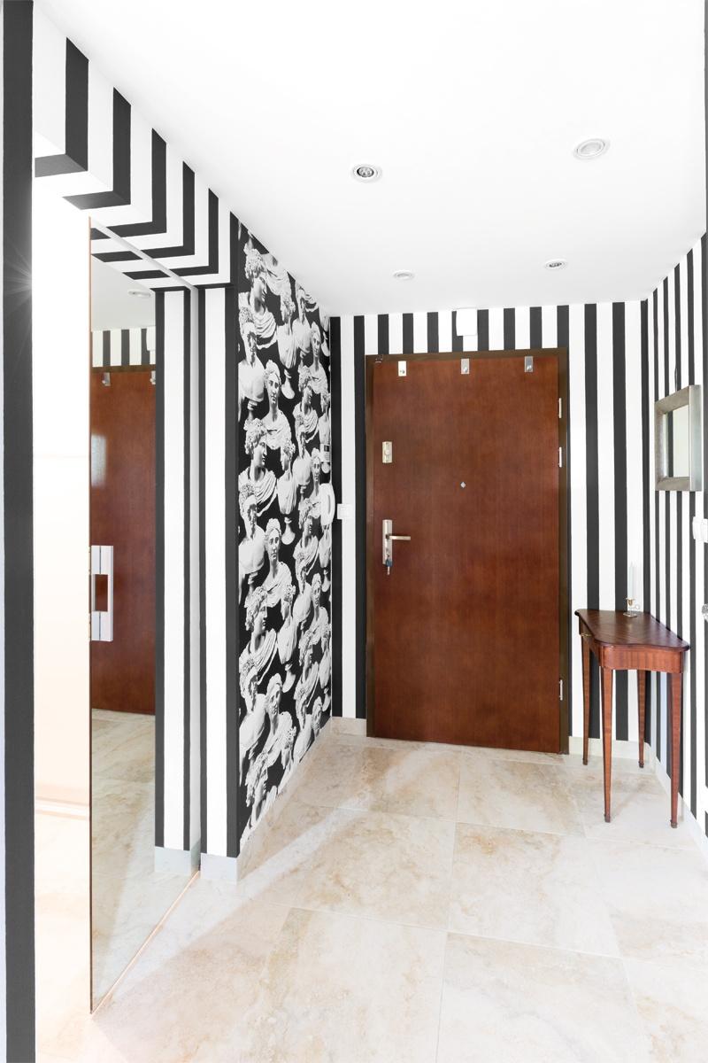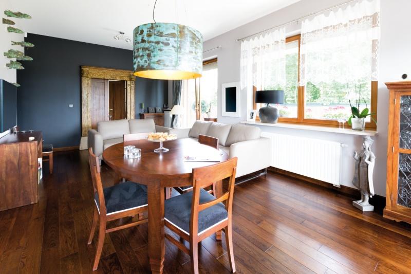 Była to inwestycja planowana przez długi czas, dlatego też do jego aranżowania właściciele zabierali się powoli i dokładnie, szczegółowo dyskutując z architektką o wszystkich detalach. Na szczęście w cały projekt wkradło się kilka spontanicznych, odważnych decyzji podjętych pod wpływem chwili. W późniejszym rozrachunku okazały się one jednymi z najbardziej trafnych i pozwoliły zamknąć całość wystroju w spójną aranżację, stanowiąc jednocześnie najbardziej charakterystyczne elementy poszczególnych pomieszczeń. Tym łącznikiem okazał się motyw czarno-białych twarzy, zastosowany zarówno w przedpokoju, jak i w kuchni przechodzącej w salon. Pozostałe części wyposażenia są w stonowanej kolorystyce, podkreślonej jedynie barwą palisandru, z którego jest wykonana większość mebli.