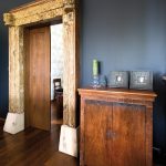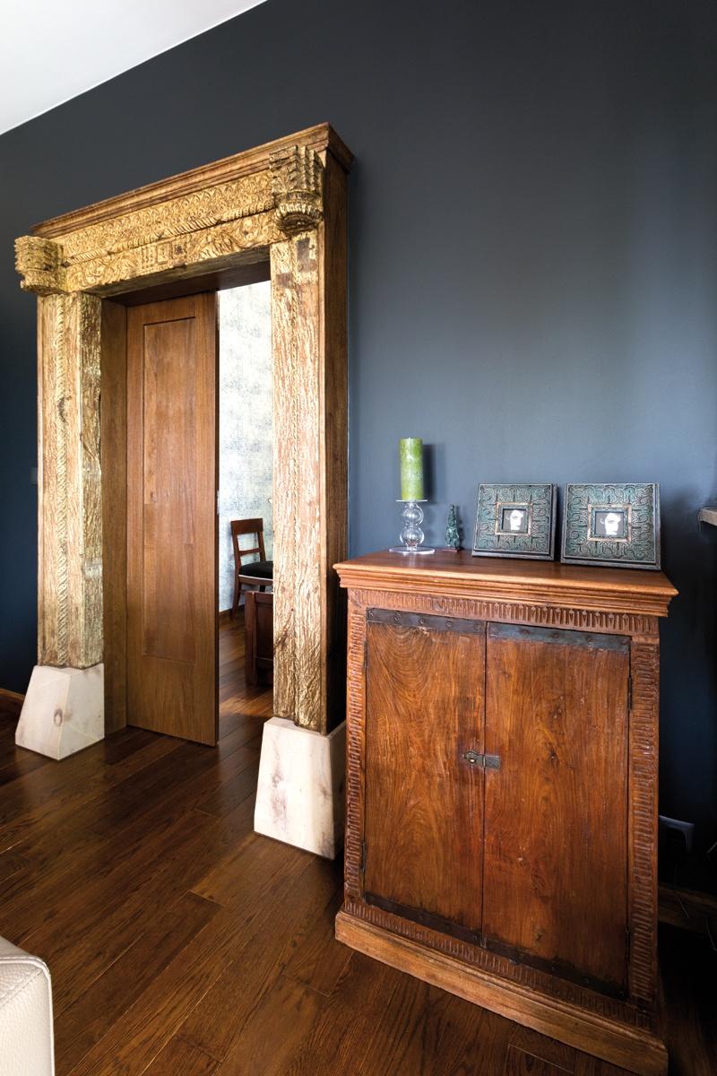 Główną osią kompozycyjną tego wnętrza jest antyczny, indyjski portal, który okala centralnie położone wejście do sypialni. W jego prawej górnej części wciąż widać ślad po dawnej tabliczce z numerem domu. Aby nadać mu szczególnie sceniczny wygląd, ściana wokół niego została pomalowana na czarno, a na portal rzucono kierunkowe światło, które po zmroku teatralnie eksponuje go na ciemnym tle. Drzwi do sypialni zostały wykonane na zamówienie, by jak najlepiej pasowały do rzeźbionych futryn. Sama sypialnia jest niewielkim pomieszczeniem, mieszczącym tylko łóżko i szafki nocne, ale dzięki szerokiemu, dwuskrzydłowemu wejściu może w ciągu dnia pozostawać otwarta na salon. Powoduje to wzajemne przenikanie się tych przestrzeni i wprowadza złudzenie, że mieszkanie jest dużo większe, niż wskazuje jego metraż.