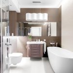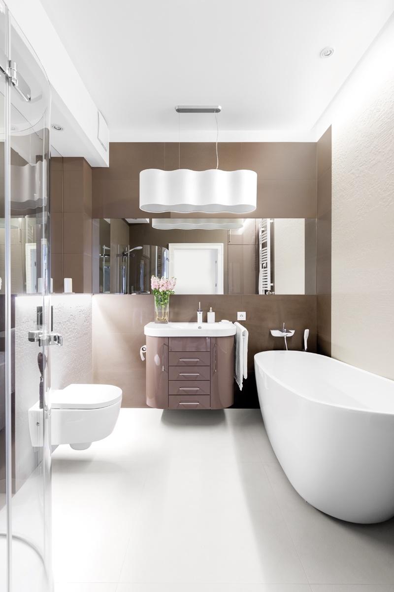 Dzięki przeróbkom w układzie funkcjonalnym mieszkania udało się uzyskać na tyle dużo miejsca w łazience, że nie trzeba było iść na żadne kompromisy. Zmieściła się w niej zarówno obszerna wanna wolnostojąca, jak i kabina prysznicowa. Dodatkowo we wnęce przy drzwiach ukryta jest zlicowana z płytkami szafka, idealnie wtapiająca się w tło, wewnątrz której ma swoje miejsce pralka oraz wszelkie przybory łazienkowe. Dla właścicieli mieszkania było szalenie ważne, aby mieć możliwość regulacji ilości oświetlenia i nastroju w zależności od potrzeb. Olbrzymia lampa wisząca nad umywalką miała spowodować, by łazienka była bliższa w swoim charakterze pokojowi kąpielowemu.