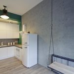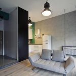 Jest tu duża narożna sofa – w dzień pełniąca funkcję relaksacyjną, a wieczorem łóżka do spania. Nad nią na jednej ze ścian znalazły się lewitujące półki na książki. Podłoga aneksu kuchennego i blat jest wykonany z tego samego drewna dębowego i doskonale pasują do surowego wnętrza. Katarzyna Patyrak miała ciekawy pomysł na łazienkę. Do połowy wysokości ściany są wykończone białymi kafelkami-cegiełkami, którymi na początku ubiegłego wieku wykładano paryskie czy nowojorskie korytarze metra. Natomiast wyżej – przygotowany tańszą, domową metodą z mieszaniny białego kleju, bejcy i barwnika – ciemnozielony tynk dekoracyjny.