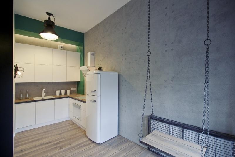Loft jest urządzony oszczędnie – minimalnie. W części dziennej powstała antresola, co zaoszczędziło trochę miejsca. Najbardziej wyróżnia się tutaj huśtawka – prosty trapez przymocowany do sufitu. Można się na niej pobujać, wyglądając przez okno.