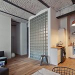 Aranżacja wnętrz to swoisty patchwork. Podłoga w łazience ułożona jest z wzorzystych, marokańskich płyt cementowych, komponujących się z betonowymi płytami na ścianach. Od salonu oddziela łazienkę ściana z luksfer. Dzięki temu wpada tu światło, a całość robi ogromne wrażenie. W salonie stoi kanapa z czterech elementów. Można je ze sobą dowolnie łączyć, tworząc na przykład dwie sofy albo cztery fotele. Obok stoi metalowe dmuchane krzesło Oskara Zięty. Widoczne są dekoracje w stylu New Mexico, a także lampy, grzejniki i różne dodatki – charakterystyczne dla industrialnych wnętrz nowojorskich loftów. To eklektyczny, choć minimalny loft dla nowoczesnej pary.