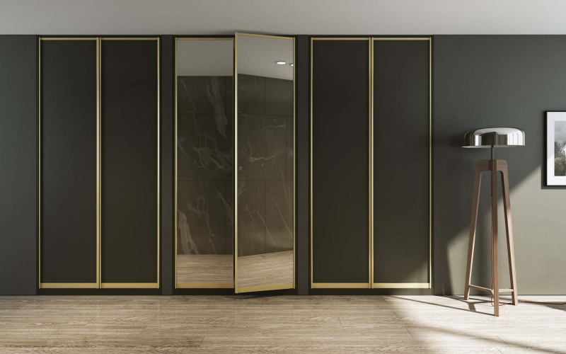 Złoto w prostym wnętrzu? Dlaczego nie! Rząd szaf, z drzwiami uchylnymi osadzonymi we wnękach, tworzy piękną kompozycję. Złote ramy idealnie pasują do stonowanego pomieszczenia – zarówno przedpokoju, jak i salonu. Wykonane na wymiar szafy wnękowe to sposób na zagospodarowanie nieużytkowanych dotąd przestrzeni. Przy okazji ograniczymy liczbę mebli w pomieszczeniu. Wykorzystany do tej realizacji system Szafir pozwala na wypełnienie skrzydeł szaf zarówno płytą w kolorze dopasowanym do ścian, jak też lustrami.