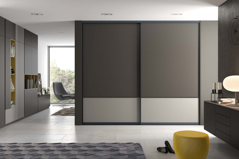 Duże meble mogą być naszym sprzymierzeńcem w prostych wnętrzach. Dodają im dostojności i wyrazistości, pomogą wprowadzić odrobię elegancji. Ciekawa wzorniczo duża szafa dwudrzwiowa to idealny wybór do salonu lub przedpokoju. Wyróżnia ją oszczędna, monochromatyczna kolorystyka – szeroką powierzchnię frontów podzielono na dwa pola kolorystyczne. Dzięki temu bryła jest lżejsza i oryginalna. Wąski profil drzwiowy w grafitowym kolorze sprawia, że cała konstrukcja jest strzelista i elegancka. W tym przypadku szafa posiada fronty przesuwne wykonane w systemie Szafir w kolorze anoda grafitowa od marki Komandor. Wypełnienie drzwi stanowi połączenie szkła satynowego z kolekcji Colorimo.