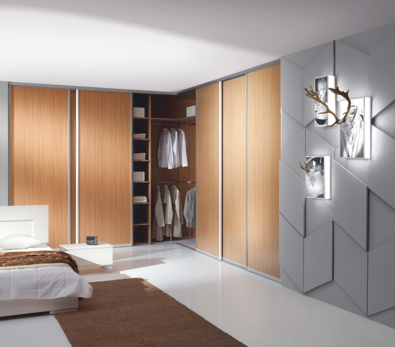 Praktyczna szafa czterodrzwiowa w systemie Lazuryt marki Komandor to sposób na najbardziej efektywne wykorzystanie niedużego pokoju. Umieszczona w rogu sypialni pozostawia na ścianach miejsce na komodę czy łóżko. Specjalny system do zabudowy narożników ułatwia dostęp do schowanych w szafie rzeczy. Fornir z naturalnym wzorem drewna dobrze pasuje do stonowanego, ciepłego wnętrza z panelami bądź deskami na podłodze i z klasycznym, prostym łóżkiem.