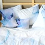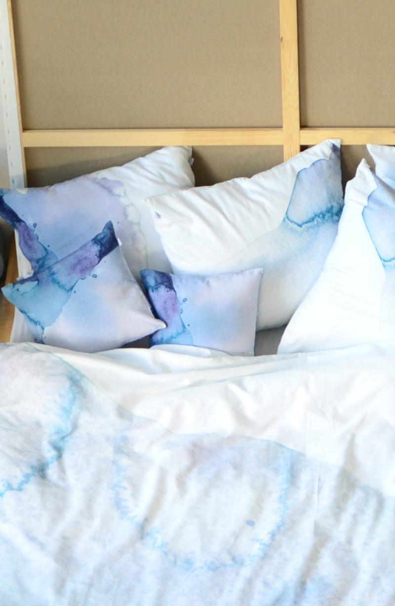Farba się wylała. Akwarele wsiąkły w materiał. Nic już z tym nie zrobisz, tak już zostanie. I to jest w tym piękne. Że tak już zostanie. Biała pościel i nieregularne plamy, a do tego delikatność, półprzezroczysty kolor, pastele, a zaraz obok mocny granat.