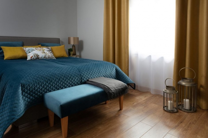 Wbrew pozorom, ciemniejsze kolory świetnie sprawdzają się w sypialni. W połączeniu ze szlachetnym materiałem tworzą luksusowe, eleganckie wnętrza. Pikowana narzuta wykonana z tkaniny przypominającej aksamit będzie praktycznym dodatkiem, dzięki któremu Twoja sypialnia zyska wytworny charakter. Jeśli wybierzesz narzutę w odcieniu błękitu pruskiego, koniecznie zestaw ją z musztardowożółtymi zasłonami – to najmodniejsze w tym sezonie kolory. Jeśli lubisz uciąć sobie drzemkę niezależnie od pory dnia, postaw na zasłony uszyte z zaciemniającej tkaniny. Nie przepuszczą promieni słonecznych nawet w południe!