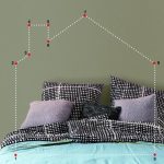 Ustaw laser krzyżowy na tryb samopoziomujący. Wyrównaj laser z lewą stroną łóżka i ustaw punkt przecięcia linii lasera na wysokości, na której ma się znaleźć punkt numer 2, który z punktem 1 wyznaczy lewą ścianę domu. Zaznacz oba punkty ołówkiem. Powtórz te same czynności z prawej strony dla punktów numer 8 i 9 (prawej ściany domu). Następnie ustaw laser na kąt 35 stopni, używając funkcji nachylenia i wymierz tak, aby linia lasera przebiegała przez punkt 2. Teraz poprowadź taśmę malarską wzdłuż lasera, tworząc obrys dachu. Powtórz czynności po prawej stronie: ustaw laser na kąt 35 stopni, używając funkcji nachylenia, i wymierz tak, aby linia lasera przebiegała przez punkt 8. Poprowadź taśmę malarską wzdłuż linii lasera. Punkt numer 7 to miejsce przecięcia się dwóch kawałków taśmy.