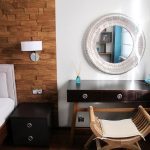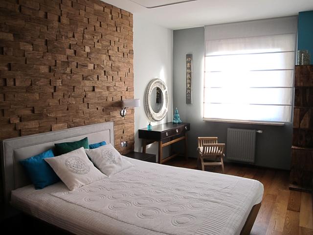 Drewniana ściana za łóżkiem oraz drewniane meble w orientalnym stylu stworzyły w sypialni przytulny klimat. Szafka nocna, choć wydaje się być nowa, została jedynie przemalowana i zyskała nowe uchwyty. Blasku nadała jej ekologiczna emalia alkidowa do drewna i metalu – „Advanced 792” marki Benjamin Moore w czarnym kolorze przełamanym czerwienią – „deep caviar 2130-20” z kolekcji Color Preview. Kolory oraz farby do sypialni wybrane zostały w salonie dekoracji wnętrz „Turkan” przy ul. Wilczyńskiego 25E/014 w Olsztynie, dystrybutora ekskluzywnych farb marki Benjamin Moore.
