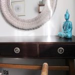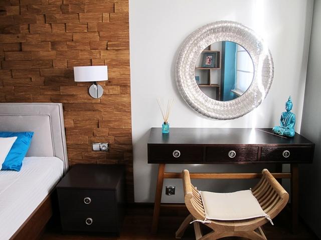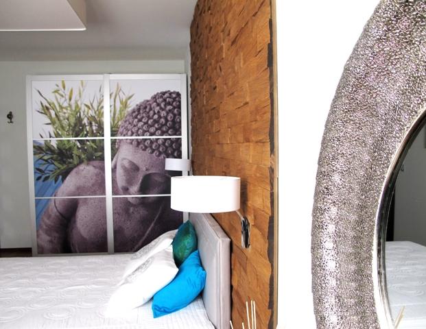 Magdalena Borowiak – Wróblewska, architekt wnętrz, autorka i prowadząca programu „Szybkie Metamorfozy” od razy zainspirowała się tą wskazówką: „Katarzyna i jej mąż są zafascynowani buddyzmem, mandalami, co stanowiło dla mnie świetną inspirację projektując ich sypialnię. Postawiłam z jednej strony na minimalizm, dlatego bazowymi kolorami we wnętrzu są ciepłe odcienie szarości, proste w swojej formie oświetlenie. Wnętrze ożywiłam turkusowymi akcentami, nawiązującymi do zdobiącej szafę fototapety z motywem Buddy. Mały fragment ściany pomalowaliśmy farbą Aura w kolorze „in the tropics – CSP 640” z kolekcji Color Stories marki Benjamin Moore. Ten turkusowy odcień w zależności od światła będzie się pięknie zmieniał ujawniając szereg półcieni nadanych przez koloranty obecne w jego recepturze. Również poduszki oraz drobiazgi na biurku są w intensywnych, przykuwających spojrzenie kolorach.”