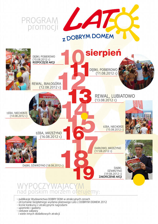 Wydawnictwo DOBRY DOM, już po raz szósty, rozpoczyna wielką akcję promocyjną LATO Z DOBRYM DODEM 2012. Od 10 do 19 sierpnia osoby wypoczywające nad polskim morzem, na 11 najlepszych plażach, będą mogły odwiedzać nasze namioty promocyjne i skorzystać z wielu atrakcji organizowanych przez nasze Wydawnictwo. Każdy, kto odwiedzi nasz namiot otrzyma prezent oraz będzie mógł wziąć udział w licznych konkursach i zabawach, wygrywając atrakcyjna nagrody, dla całej rodziny!