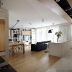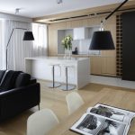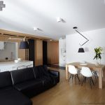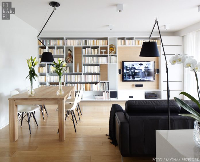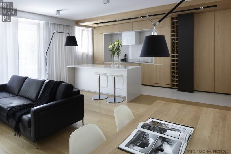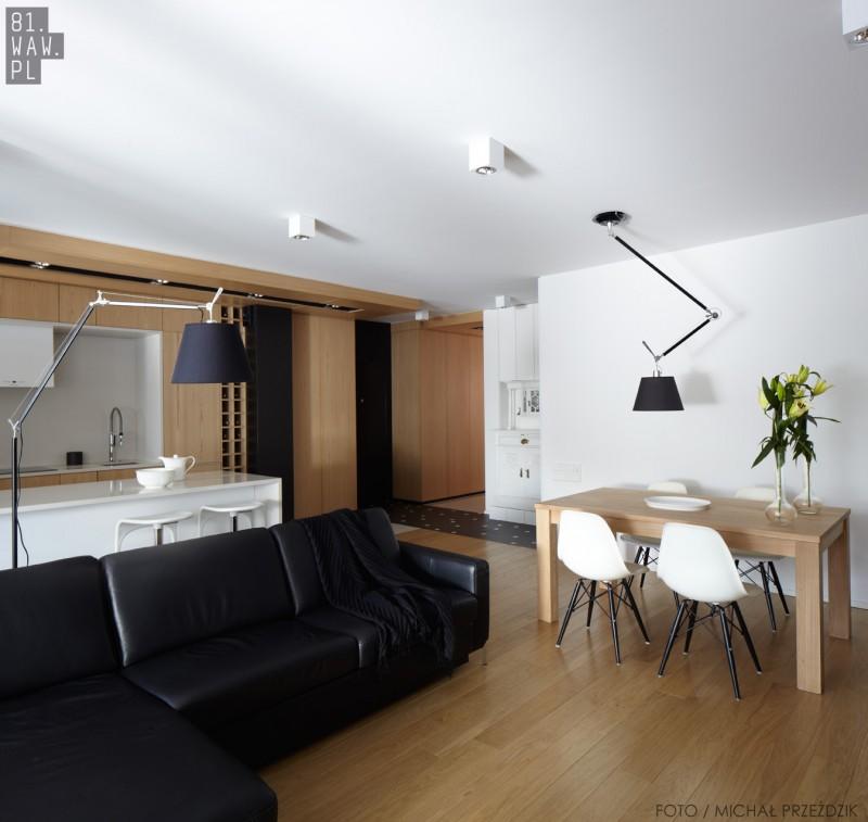 W połączonym z kuchnią i jadalnią salonie dominują wyraźne czarne akcenty – ciemna sofa i lampy. Jednak cała reszta – ściany, podłoga i pozostałe meble zostały utrzymane w biało-czarnej tonacji. Dzięki temu mieszkanie wycisza, emanuje pozytywną energią i jest niesamowicie jasne, nawet w zimowe, krótkie dni.