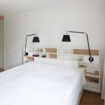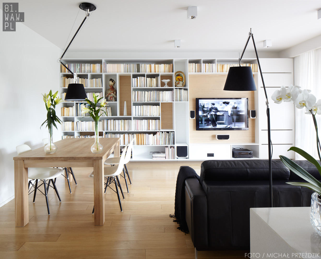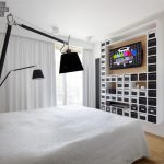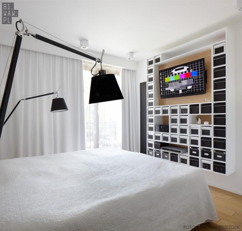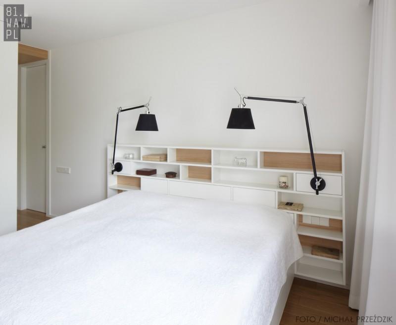 Od charakteru mieszkanie nie odbiega również sypialnia. Architekci z 81.WAW.PL zdecydowali się na ascetyczny wręcz wystrój sypialnianego pokoju. Dyskretne białe łóżko, regał w tym samym kolorze i zawieszona nad podłogą nowoczesna, oczywiście biała, meblościanka tworzą prawdziwe bajkowe królestwo. Jedynie lampki nocne i podłoga są w innym kolorze, a pomieszczenie wydaje się dzięki temu znacznie większe niż jest w rzeczywistości.