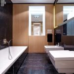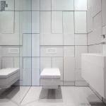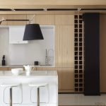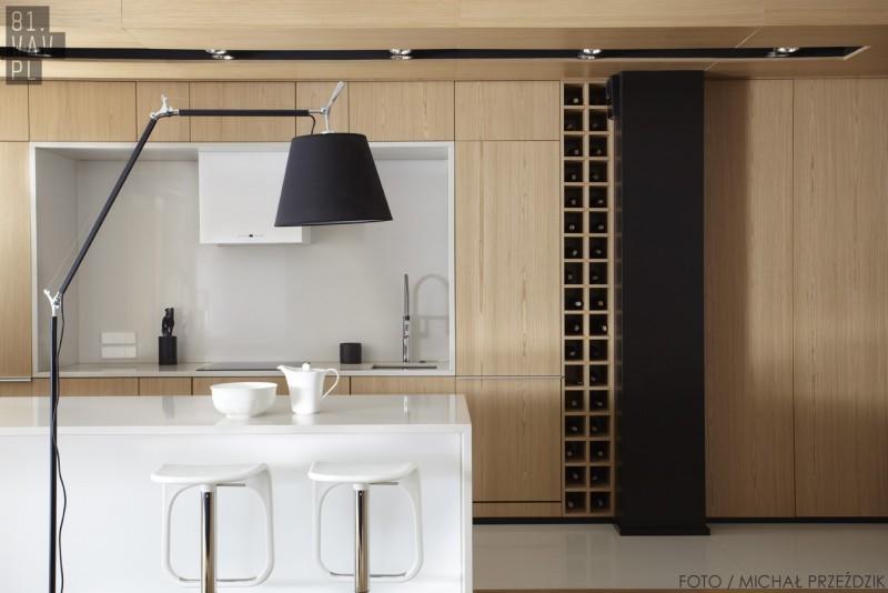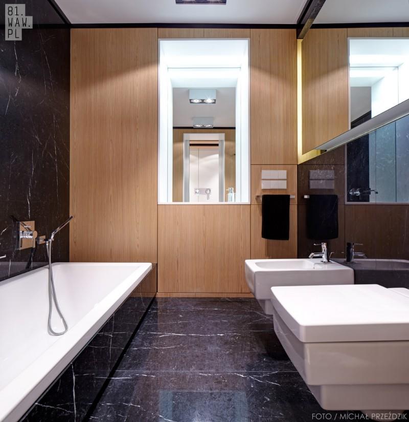 Dużym atutem mieszkania urządzonego przez architektów jest właśnie geometryczna, dyskretna zabudowa wolnych przestrzeni. Przesuwane panele, obudowy kuchenne czy szafki łazienkowe z drewna są w surowym, minimalistycznym wnętrzu uniwersalnym i stylowym dodatkiem. Materiał świetnie sprawdza się też w łazience. Pomieszczenie w służewieckim apartamencie zostało urządzone właśnie w drewnie, nieoczekiwanie przełamanym naturalnym kamieniem – czarnym marmurem z białymi żyłami.