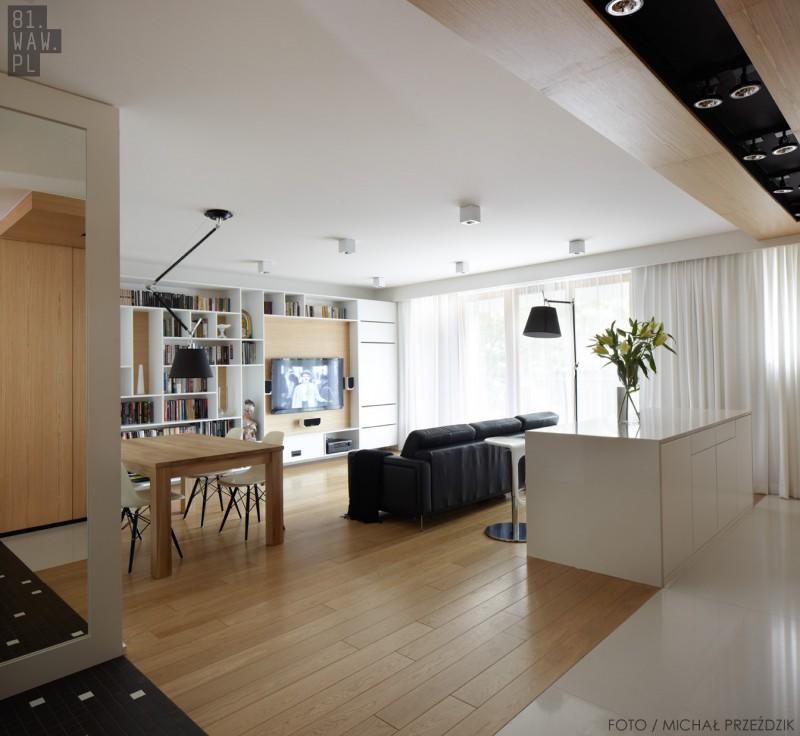 Tak też stało się w świeżo ukończonym apartamencie na warszawskim Służewcu. Przestronny, 110-metrowy lokal, zaprojektowany przez architektów z warszawskiej pracowni, już w założeniu miał być połączeniem drewna z czernią i bielą. – Takie połączenie wcale nie znaczy, że mieszkanie wygląda nudno czy przytłaczająco, wprost przeciwnie – zapewnia Anna Paszkowska z 81.WAW.PL. Drewno najlepiej łączyć ze stonowanymi kolorami, takimi jak czerń, biel czy cafe latte. – Generalnie drewniane elementy wykończenia mają tę zaletę, że pasują zarówno do glazury, jak i terakoty, a także kamienia i farby. Rodzaj materiału, jaki łączymy z drewnem, nie ma znaczenia, a efekt jest zawsze ciekawy – podkreśla projektantka.