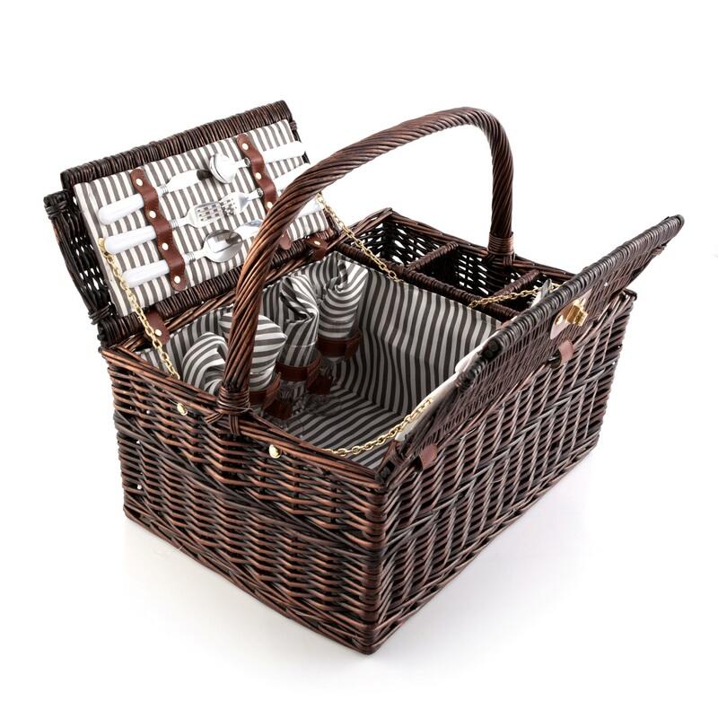 Dwuosobowy GARDEN KOSZ w kształcie walizki to idealne rozwiązanie dla par. Wyposażony w podwójne zestawy sztućców, talerzy i filiżanek, a także korkociąg oraz pojemniczki na sól i pieprz pozwoli spędzić przyjemnie czas. Posiada wystarczająco dużo miejsca na owoce, kanapki czy butelkę wina. Druga propozycja – kosz JOGI – zawiera cztery zestawy sztućców, talerzyków, szklanych kieliszków i białych, bawełnianych serwetek. Kosz posiada również trzy przegródki na butelki. Do kosza możemy schować potrzebne na piknik produkty do łącznej wagi 15 kg.