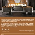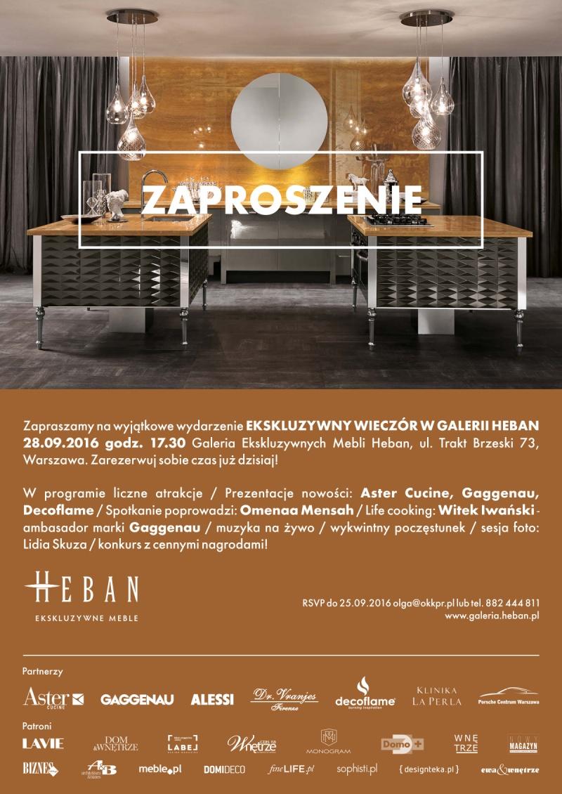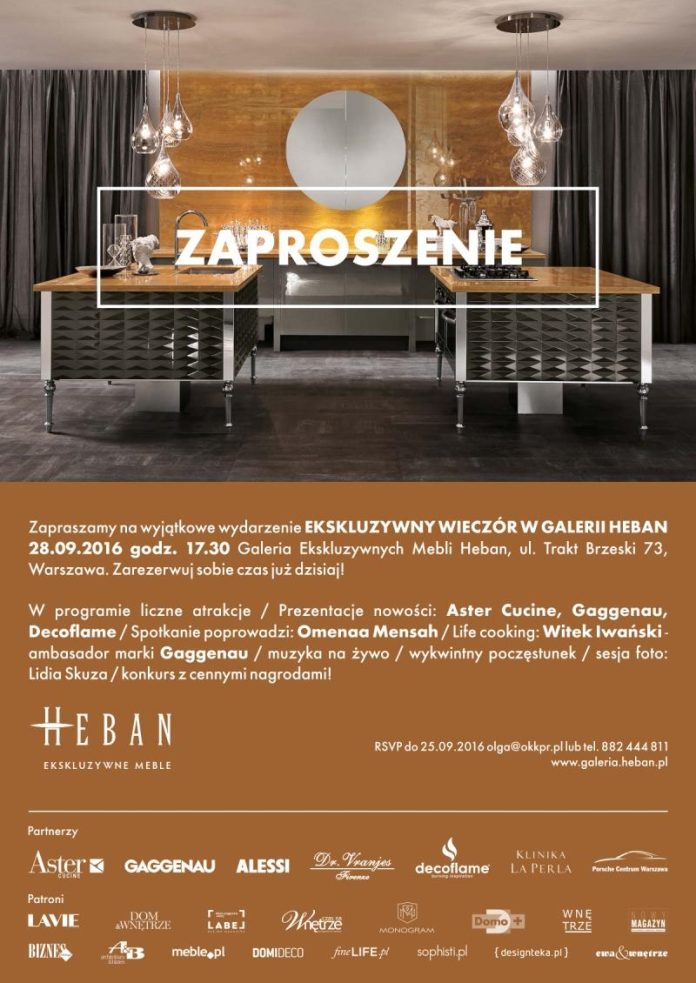 Ekskluzywny Wieczór w Galerii Heban rozpocznie się 28 września 2016 r. o godzinie 17:30 przy ul. Trakt Brzeski 73 w Warszawie. W programie między innymi prezentacja nowości marek ASTER CUCINE, GAGGENAU oraz DECOFLAME. Organizatorzy zapowiedzieli także koncert muzyki smyczkowej, life cooking w wykonaniu mistrza kuchni Witka Iwańskiego – kulinarnego ambasadora marki Gaggenau i wykwintny poczęstunek. Na wszystkich gości wydarzenia czekają również luksusowe upominki – perfumy do wnętrz i ciała Dr. Vranjes, konkurs z cennymi nagrodami oraz sesja fotograficzna w obiektywie cenionej polskiej fotografki Lidii Skuza. Spotkanie poprowadzi Omennaa Mensah – znana prezenterka telewizyjna, założycielka fundacji Omenaa Foundation i właścicielka marki Ammadora.