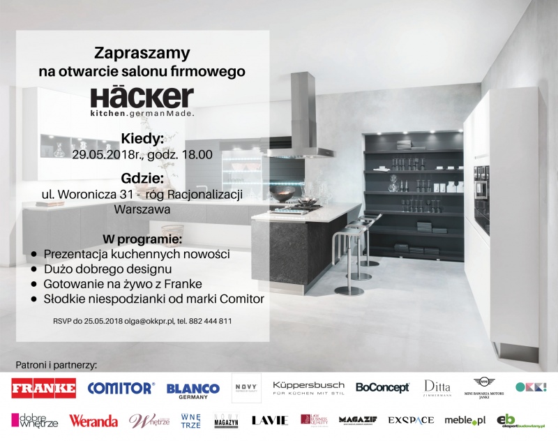 W maju, Häcker otworzy swój pierwszy pokazowy salon w Warszawie. Podczas wydarzenia nie zabraknie przeglądu najnowszych kuchennych trendów. Partnerem spotkania będzie między innymi marka Comitor, która zaprezentuje nowości z oferty Küppersbush, Novi oraz Blanco. Nowoczesne, kuchenne rozwiązania zaprezentuje również firma Franke. To jednak nie koniec atrakcji. W trakcie spotkania odbędą się pokazy gotowania na żywo. Na gości czekają także słodkie niespodzianki. Spotkanie poprowadzi Olga Kisiel-Konopka z OKK!