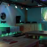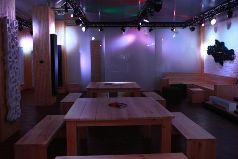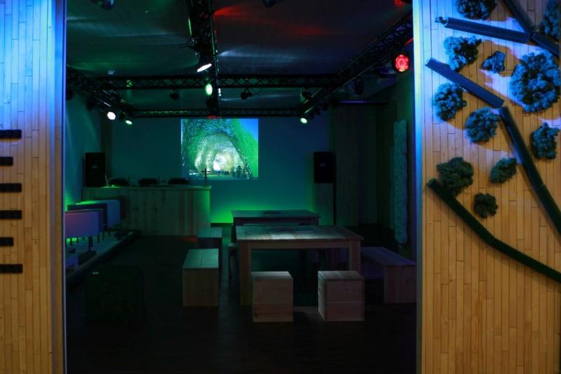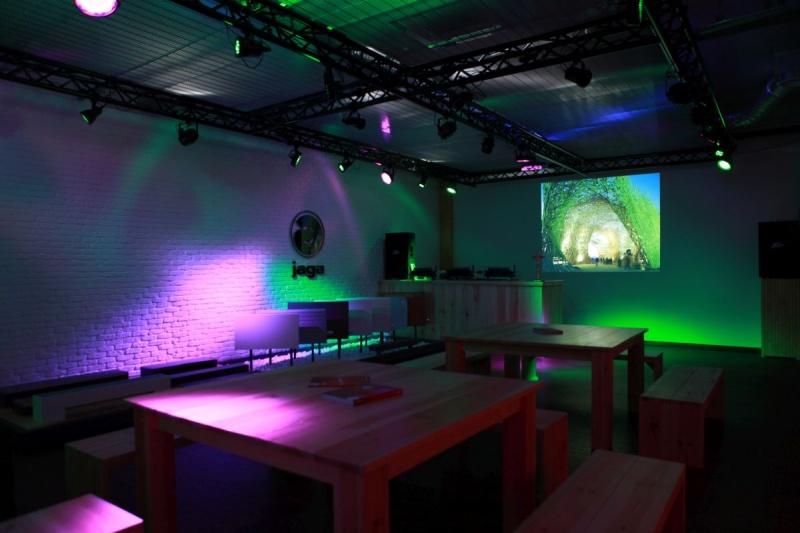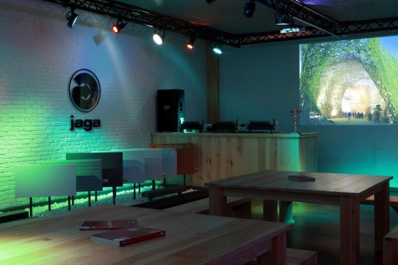 Dominującym materiałem w salonie jest jasne, surowe drewno, w dużej części pochodzące z recyklingu, któremu towarzyszy bielona cegła. Magiczny nastrój we wnętrzu buduje sceniczne, multifunkcjonalne oświetlenie, które jest ważnym elementem aranżacji. Pomieszczenie wyposażone jest w profesjonalne nagłośnienie oraz nowoczesne multimedia. Salon jest autorską koncepcją Jaga Polska, zrealizowaną według pomysłu firmy.