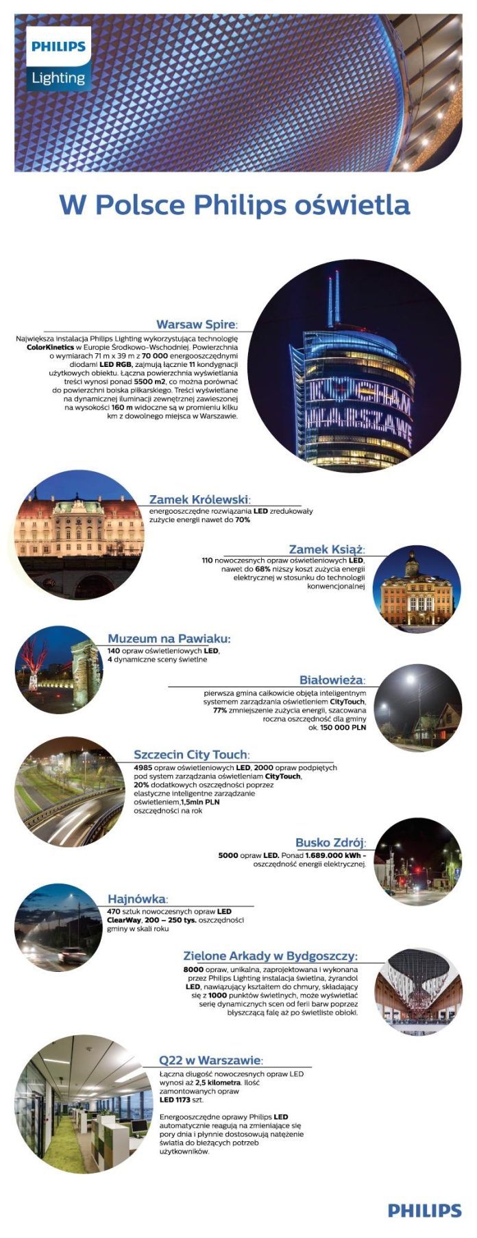 „Nieustannie dążąc do stawiania świata w lepszym świetle staliśmy się pionierem rozwoju inteligentnych technologii i systemów oświetleniowych LED. A to, co jeszcze kilka lat temu wydawało się futurystyczną fantazją, dzisiaj jest już wdrażane na rynku. Wyjście poza samą funkcjonalność ON/OFF oznacza, że dostarczamy nie tylko światło, które pozwala widzieć, ale światło, które adresuje konkretne potrzeby odbiorów indywidualnych i przedsiębiorstw. Dodając do oświetlenia czynniki inteligencji, czytając dane, przesyłając je do odbiorców można optymalizować wiele procesów ważnych zarówno dla biznesu jak i konsumenta.”- mówi Bogdan Rogala, Wiceprezes Zarządu, Dyrektor Handlowy Philips Lighting Poland. – Systemy oświetleniowe LED Philips Lighting to szereg korzyści dla odbiorców. Pomagają efektywnie prowadzić biznes, tworzą wizerunek marek i miejsc w Polsce oraz na świecie. Philips Lighting kreuje przestrzeń publiczną poprzez wydobywanie zabytków z ciemności. Zdrowe oświetlenie stwarza odpowiednie warunki pracy w biurach, pomaga najemcom oraz pracownikom podwyższać komfort pracy i dbać o wzrok. Ogromne znaczenie ma oszczędność energii nawet do 70% oraz redukcja kosztów serwisu i utrzymania. Nie ma w Polsce regionu, województwa czy powiatu, w którym nie byłyby zainstalowane rozwiązania Philips Lighting. Szacujemy, że co trzecia oprawa drogowa w Polsce jest marki Philips!