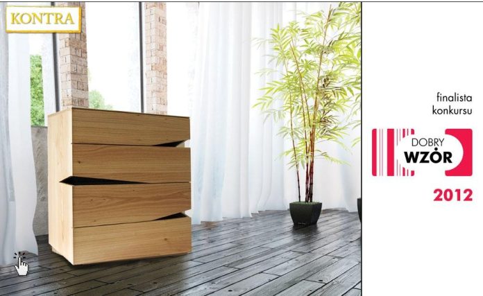 Wśród finalistów tegorocznego konkursu znalazła się między innymi drewniana komoda polskiej firmy Gacca. Model ‘Kontra’ to klasyczna, prostokątna komoda z czterema szufladami, której tradycyjność złamano poziomymi i ukośnymi wcięciami szuflad. Dzięki temu prostemu zabiegowi front mebla zyskał lekkość i oryginalną, nieprzeciętną formę. Komoda Gaccy będzie walczyć o zwycięstwo z innymi produktami w kategorii strefa domu.