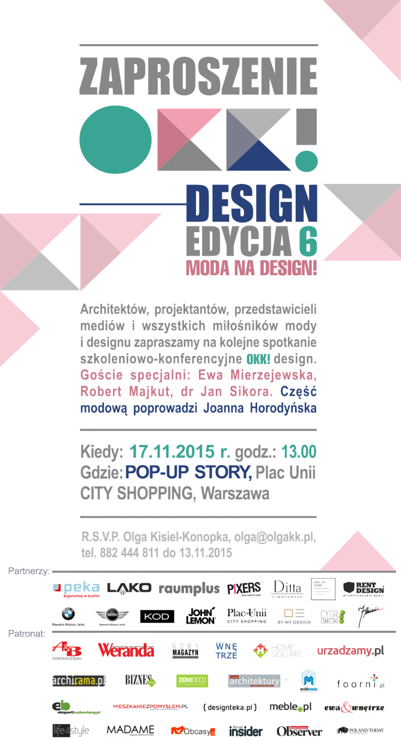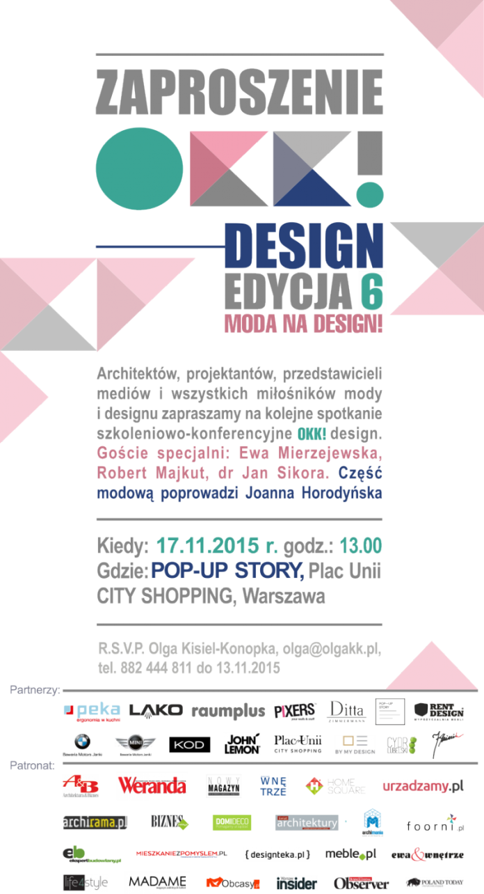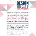 Wspólnie z przedstawicielami firm rynku wnętrzarskiego, reprezentantami środowiska akademickiego, czołowymi projektantami form przemysłowych i ludźmi ze świata mody zapraszamy do udziału w kolejnej edycji spotkania szkoleniowo-konferencyjnego, które odbędzie się 17.11.2015 w godzinach: 13.00 – 21.00 w POP UP STORY – strefa DESIGNU w budynku PLAC UNII LUBELSKIEJ w Warszawie. Motyw przewodni spotkania: MODA NA DESIGN!