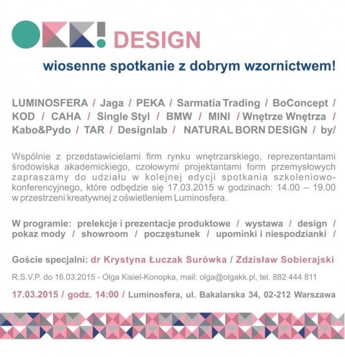 Wspólnie z przedstawicielami firm rynku wnętrzarskiego, reprezentantami środowiska akademickiego, czołowymi projektantami form przemysłowych zapraszamy do udziału w kolejnej edycji spotkania szkoleniowo-konferencyjnego, które odbędzie się 17.03.2015 w godzinach: 14.00 – 19.00 w przestrzeni kreatywnej z oświetleniem Luminosfera.
