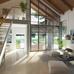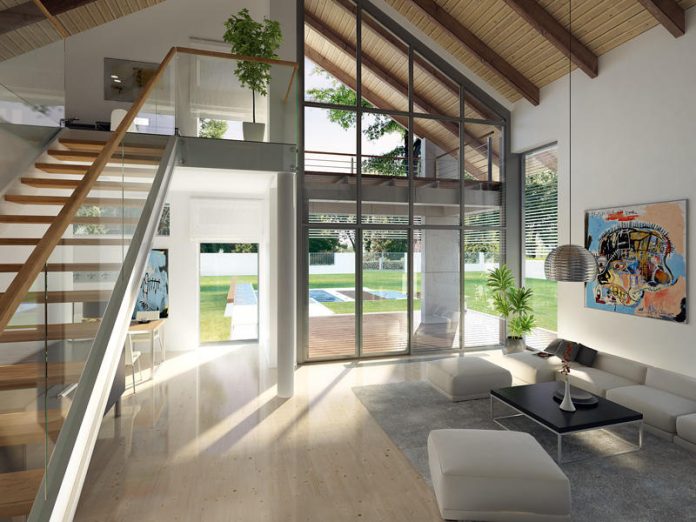 Bryła domu jest prosta. Elementy rozczłonkowujące elewacje, takie jak: żelbetowa wiata garażowa czy balkon, zostały zdylatowane od głównej bryły obiektu, aby zminimalizować ryzyko powstania mostków termicznych. Poprawne zorientowanie domu względem stron świata pozwoli na pełne wykorzystanie ciepła promieni słonecznych, które poprzez szklaną fasadę ogrzeją pokój dzienny i antresolę. W miesiącach letnich, kiedy może nastąpić przegrzewanie pomieszczeń, duży okap i rolety zewnętrzne zapewnią wystarczającą ilość cienia. Wewnątrz obiektu zaprojektowano dużo otwartych przestrzeni: korytarz, pokój dzienny, jadalnię z kuchnią i antresolę – takie rozwiązanie pozwoli na swobodną cyrkulację powietrza.
