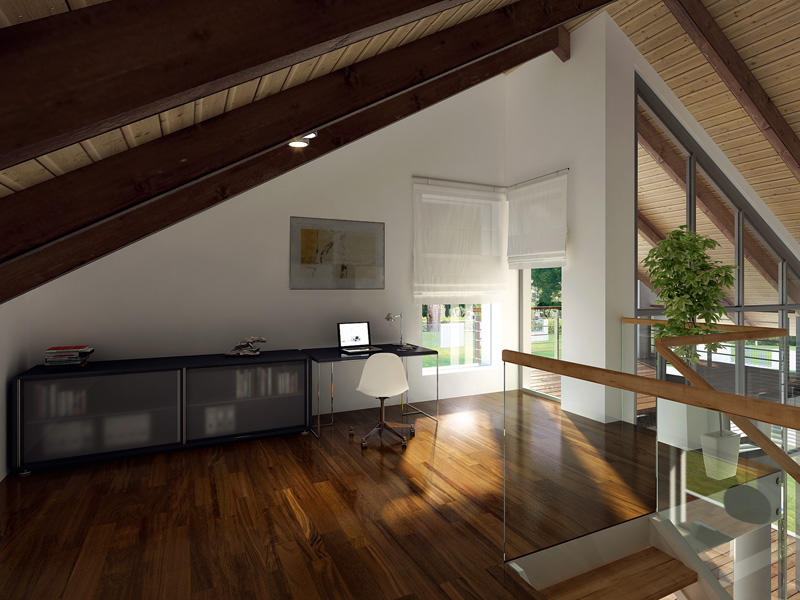 Układ funkcjonalny domu odbiega od standardu, do jakiego przyzwyczailiśmy się przeglądając ofertę projektów domów gotowych. Na antresolę prowadzą schody, które oprócz funkcji komunikacyjnej stanowią ozdobę salonu. Na poddaszu nie znajdziemy typowych trzech sypialni i łazienki. Całe poddasze zostało zarezerwowane na przestronną sypialnię właścicieli domu, garderobę i łazienkę. W sypialni zaprojektowano duże okno, po odsłonięciu którego można podziwiać salon, a przez szklaną witrynę ogród. Jest to nietypowe rozwiązanie, które pozwoli na optyczne powiększenie sypialni. Dodatkowe dwa pokoje, łazienkę oraz oddzielne wc zaprojektowano na parterze. Jeśli z jakichś względów inwestor zdecyduje się na zamianę wiaty na garaż poprzez zamurowanie bocznych otworów oraz wstawienie wjazdowej bramy garażowej, to istnieje możliwość wykonania dodatkowego otworu w kotłowni, który połączyłby dom z powstałym w ten sposób garażem.