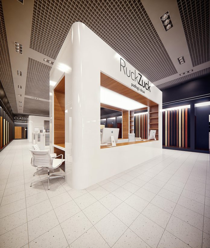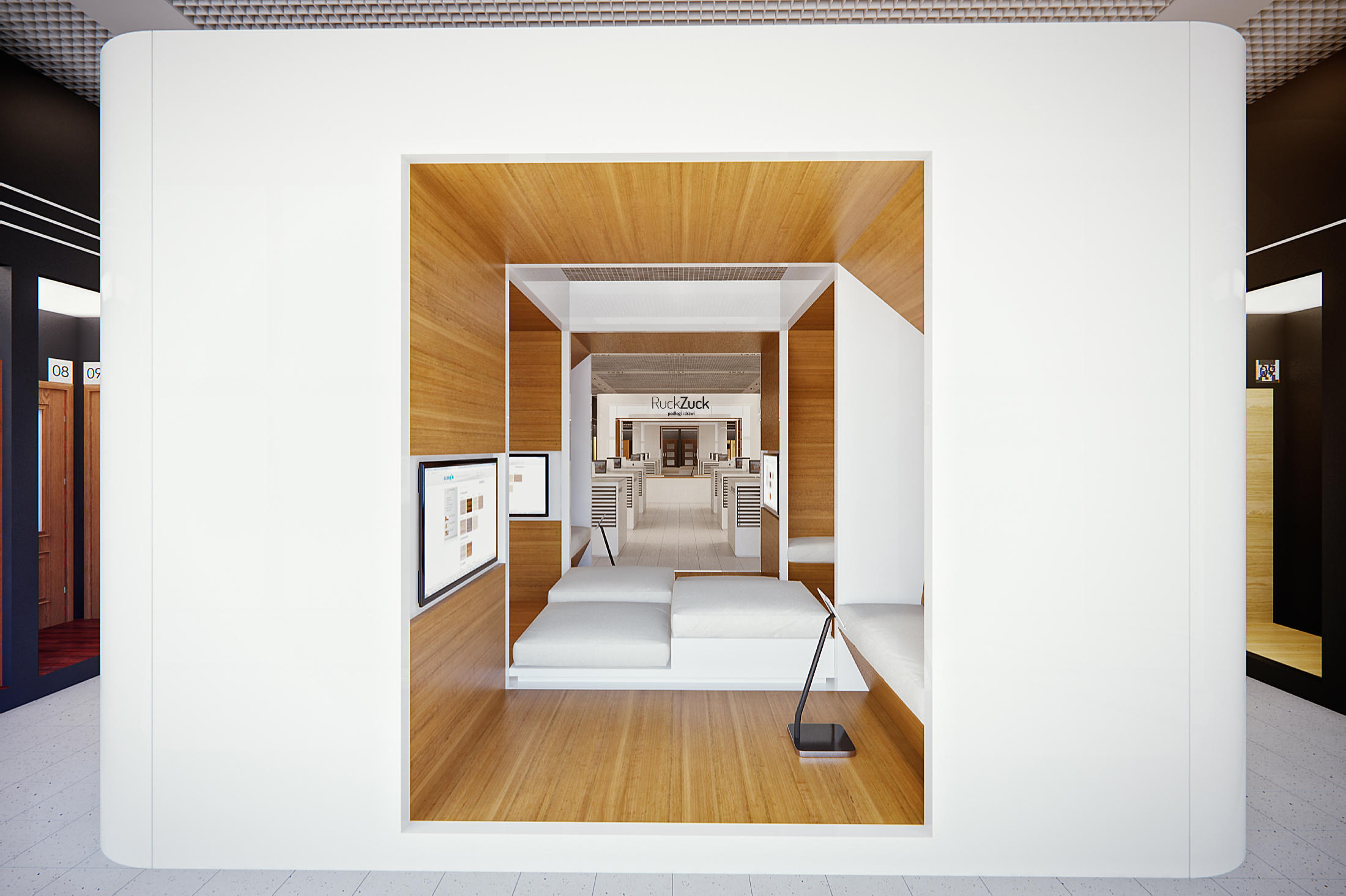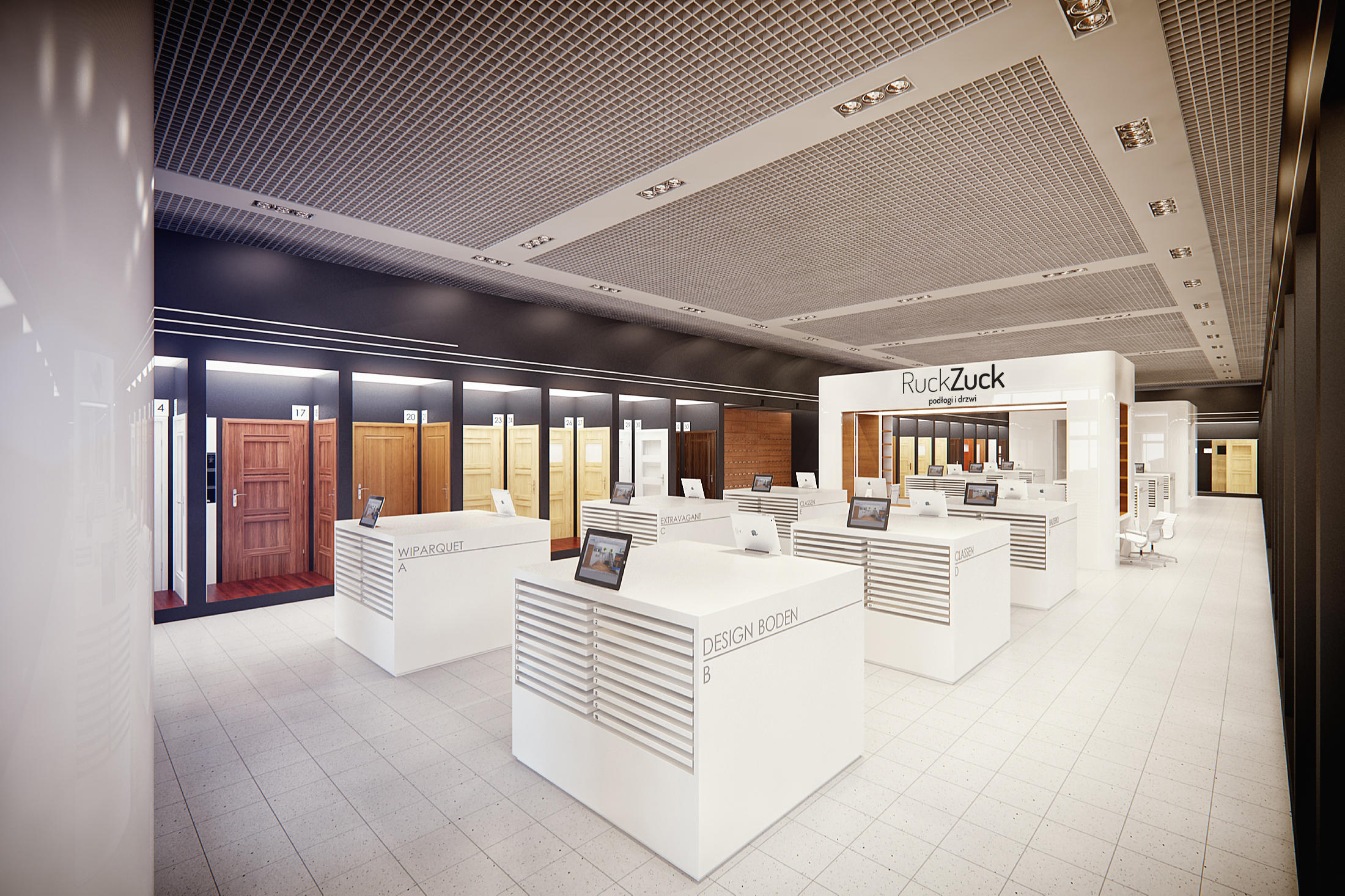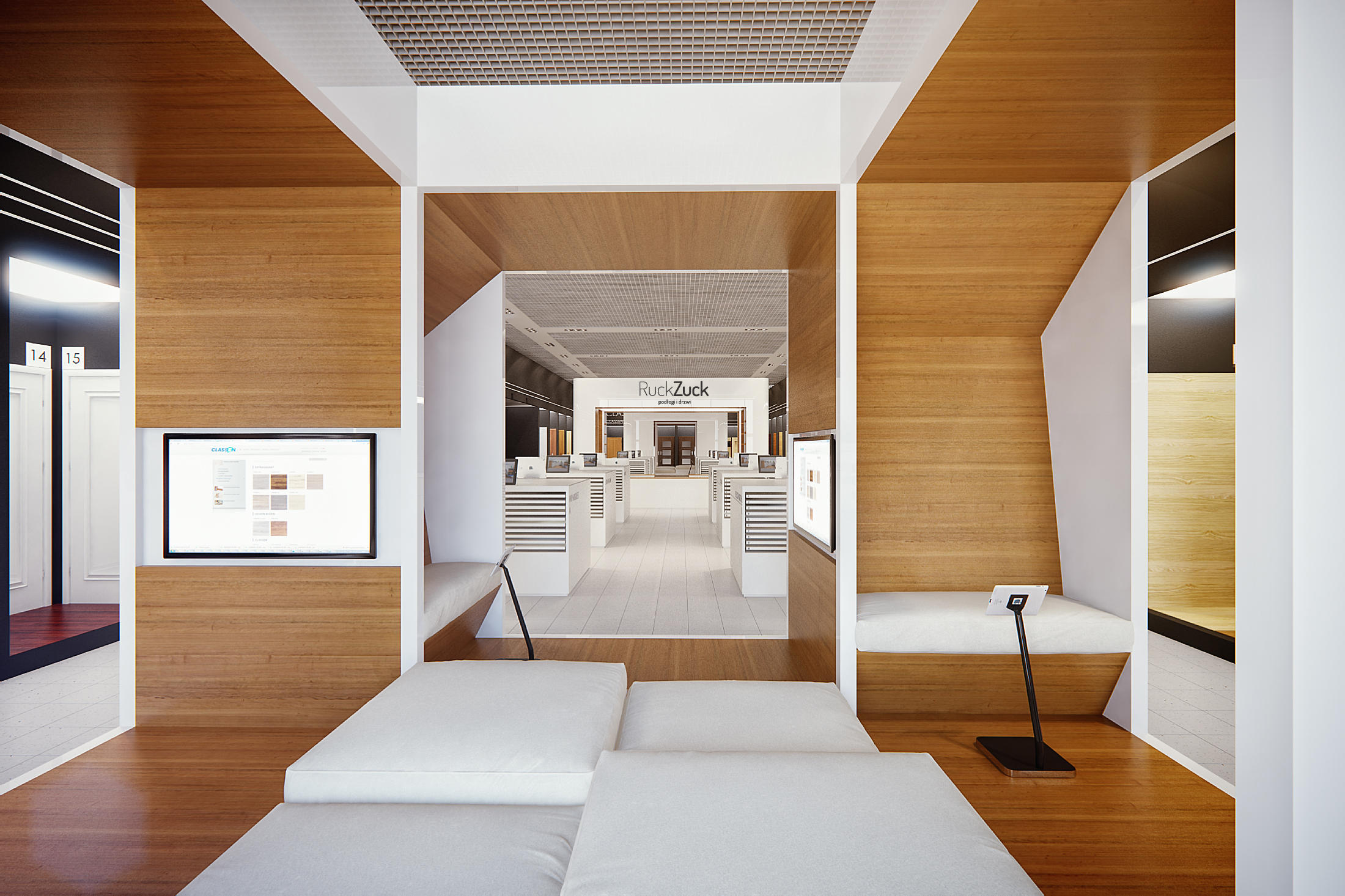 Nowy salon RuckZuck to designerski, zaprojektowany z dbałością o każdy detal sklep, na pierwszy rzut oka przypominający ekskluzywny showroom. Wnętrze zostało wyposażone w białe ekspozytory z wysuwanymi wzornikami podłóg, skórzane wygodne białe kanapy i telewizory plazmowe na ścianach. Skrzydła drzwiowe zostały wyeksponowane w czarnych, matowych i podświetlanych boksach, a wnętrza stanowisk z multimedialnymi konfiguratorami zdobione kolorem miodowego drewna. Za projekt sklepu odpowiada uznana pracownia architektoniczna z Warszawy.