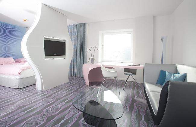 Jako kontrast wobec szarej, kubicznej bryły, we wnętrzach dominują kuliste kontury, jaskrawe kolory i elementy pop. Autorem tego niepowtarzalnego charakteru wnętrz jest, nagradzany wielokrotnie, nowojorski projektant Karim Rashid, którego znakiem rozpoznawczym są wnętrza w stylu digi pop – połączenie żywych kolorów i dynamicznej geometrii. Swymi niekonwencjonalnymi pomysłami wykreował stylowe, ekscytujące wnętrze designerskiego hotelu klasy międzynarodowej. „Jesteśmy przekonani, że dzięki połączeniu niezwykłej architektury oraz designerskiego wyposażenie wnętrz, hotel nasz, stanie się „pierwszym wyborem” wśród czterogwiazdkowych hoteli w Berlinie i okolicach”, mówi Jan Hein Simons, dyrektor nH Hoteles w Niemczech.
