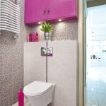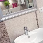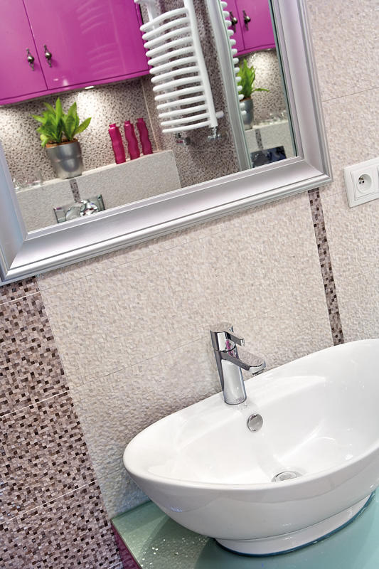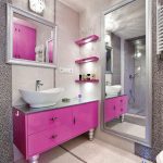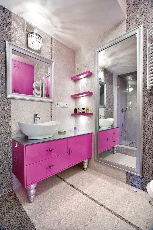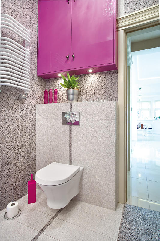 W kreowaniu wizji łazienki nieoceniona okazała się rola pani architekt, która zaplanowała jej układ i dobór kolorystyki opartej na kontraście dwóch kolorów – spokojnego i eleganckiego srebra przełamanego energetyczną fuksją. Dynamiczne i zarazem intrygujące zestawienie tych odcieni w połączeniu z ciekawymi elementami wyposażenia nadało realizacji rumieńców i zdecydowało o jej wyjątkowości. Łazienka posiada wiele atutów jest kobieca oraz bardzo wygodna. Na uwagę zasługuje zastosowanie w niewielkiej odległości od siebie dwóch luster – to rozwiązanie okazało się bardzo wygodne w codziennym korzystaniu z łazienki, podkreśliło jej ciekawy charakter, a poza tym optycznie powiększyło przestrzeń. Swoje miejsce znalazły tutaj również elementy dekoracyjne takie jak świece oraz świeże kwiaty, które dodały wnętrzu uroku.