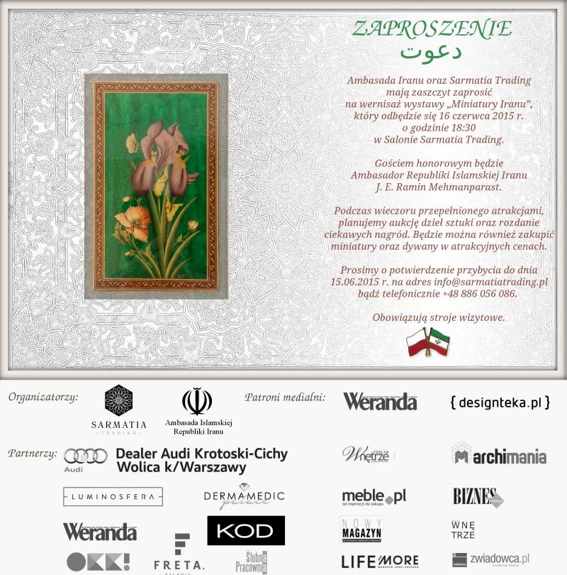 16 czerwca 2015 r. o godzinie 18:30 w warszawskim Salonie Sarmatia Trading odbędzie się wernisaż wystawy „Miniatury Iranu”. Współorganizatorem wydarzenia jest Ambasada Iranu, gościem honorowym będzie Ambasador Republiki Islamskiej Iranu J.E. Ramin Mehmanparast. Zaproszeni będą również inni dyplomaci m.in. z Indii, Pakistanu i Afganistanu.