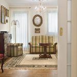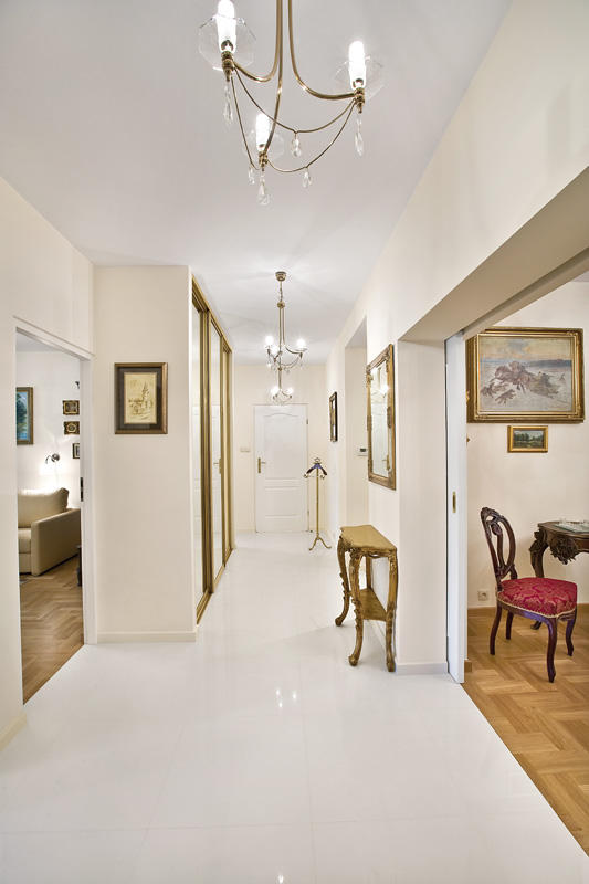 Już po przekroczeniu progu mieszkania wchodzimy w nieco inny świat. Elegancja, klasa i szyk to cechy, którymi można określić to wnętrze. Pani Jolanta, rodowita krakowianka, chciała wprowadzenia dużej ilości światła do mieszkania, w konsekwencji powstał jasny i słoneczny hol, który wręcz zaprasza do środka. Bazą stały się ściany i płytki w kolorze écru, które podkreślają wyjątkowość kryształowych luster, w mocno zdobionych, złotych ramach. Niewątpliwie uwagę przyciąga piękna konsola, która jest zapowiedzią pozostałych wnętrz. Delikatne, złote żyrandole z połyskującymi w świetle wiszącymi kryształami, nadają lekkości pomieszczeniu oraz wspaniale współgrają z jego charakterem. Tu wyczuwa się ducha przeszłości ubranego w stylową nowoczesność. Stare złoto, antyki, stylizowane meble i dodatki, delikatne neutralne tło a to wszystko wypełnione światłem i wawelskim klimatem. To dom ludzi lubiących klasykę i szanujących przeszłość.