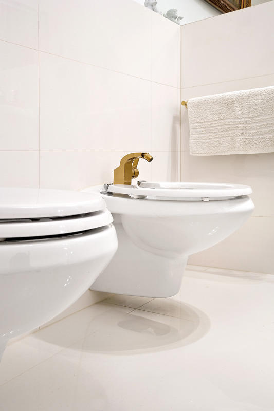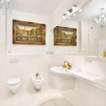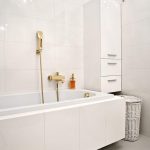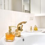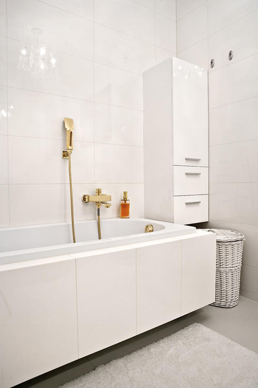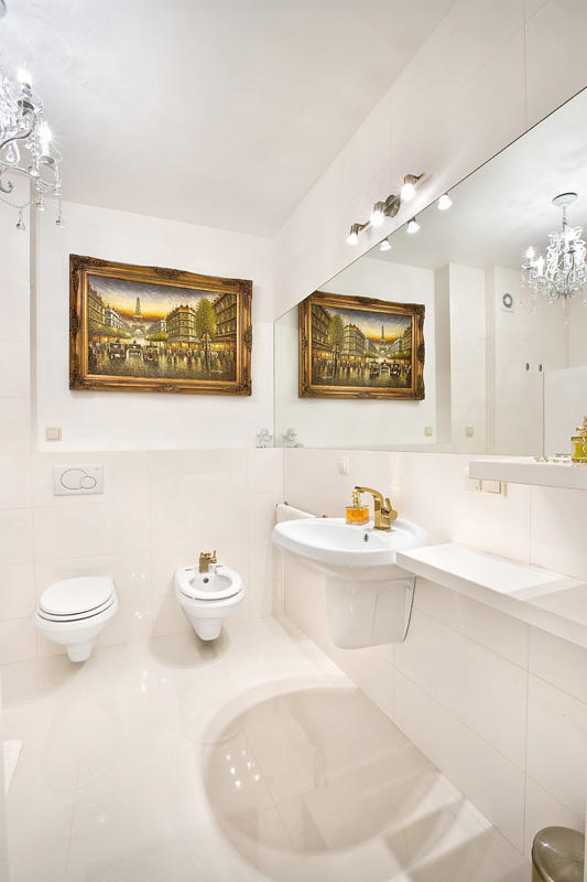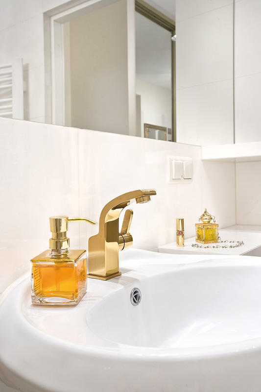 Łazienka to znakomite połączenie „starego z nowym”. Właściciele połączyli w niej dwa światy. Tu teraźniejszość idzie w parze z przeszłością, klasyczna sztuka przenika się z nowoczesnością, a bogactwo złotych elementów idealnie współgra z jasną, stonowaną kolorystyką. Każda kobieta czuje się tutaj dobrze. Neutralna, jednolita gama barwna jest wspaniałą bazą i daje nieograniczoną możliwość komponowania wnętrza, w zależności od nastroju, czy pory roku. Odpowiednie dodatki w jednobarwnej tonacji są zawsze pięknie wyeksponowane, a łazienka nabiera nowego wyrazu. Piękny obraz z widokiem Paryża jest nawiązaniem do pozostałej części mieszkania. Złota armatura nadaje szyku, klasy i niezwykłej elegancji. Świetnym dodatkiem są szklane flakoniki z bursztynowym mydłem, które wydają się być drogimi perfumami. Bogaty kryształowy żyrandol podkreśla styl minimalistycznej łazienki. Idealnie odbija światło, przez co salon kąpielowy wydaje się być zawsze promienny i jasny.
