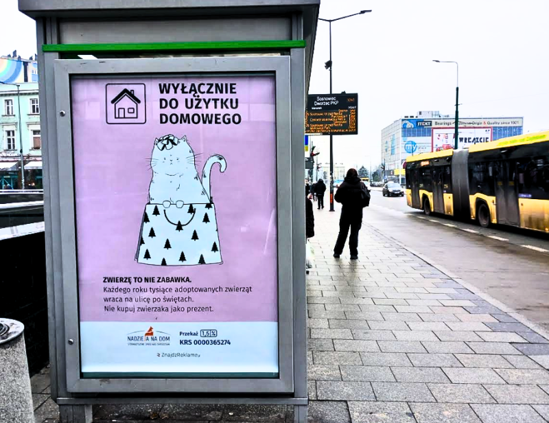 „Do użytku tylko pod nadzorem osoby dorosłej” – taki napis można zobaczyć na wielu produktach. Teraz jest także akcentem akcji mającej pomóc zwierzętom. Wydawało się, że czasy kiedy psy, koty czy króliki stawały się prezentami, już minęły. Ale jesteśmy „nieprzemakalni” i nadal trzeba nas uczyć. Stowarzyszenie opieki nad zwierzętami „Nadzieja na dom” w najnowszej kampanii billboardowej przestrzega przed kompulsywnym kupowaniem zwierząt, które po świętach często są porzucane i trafiają do schronisk.