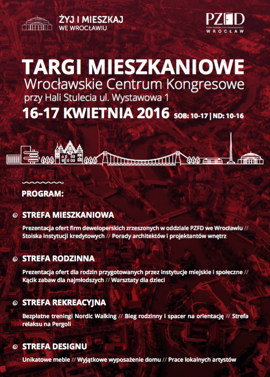 W dniach 16-17 kwietnia w Hali Stulecia odbędzie się 6. edycja targów nieruchomości Żyj i Mieszkaj we Wrocławiu. W programie wydarzenia, podobnie jak w poprzednich edycjach, oprócz oferty firm deweloperskich znajdziemy stoiska instytucji miejskich i społecznych czy lokalnych designerów. Organizatorzy przewidzieli również wiele atrakcji dla dzieci.