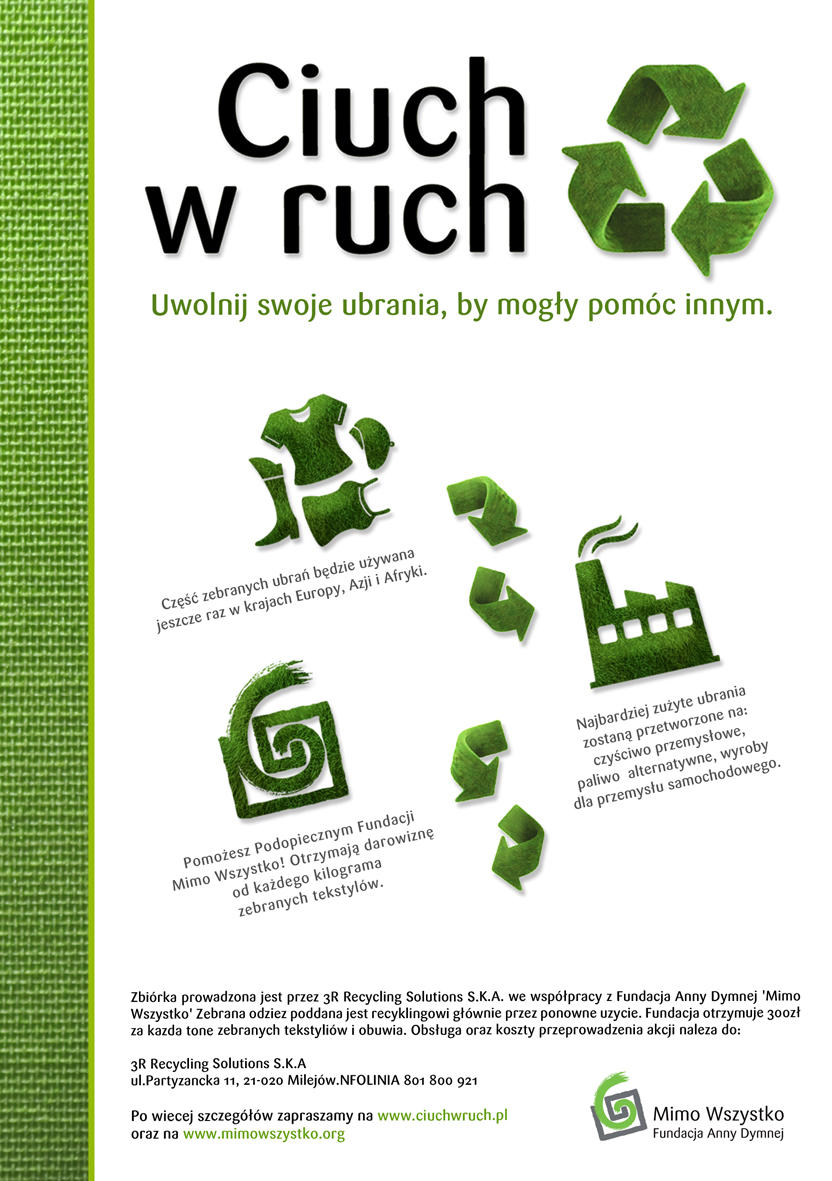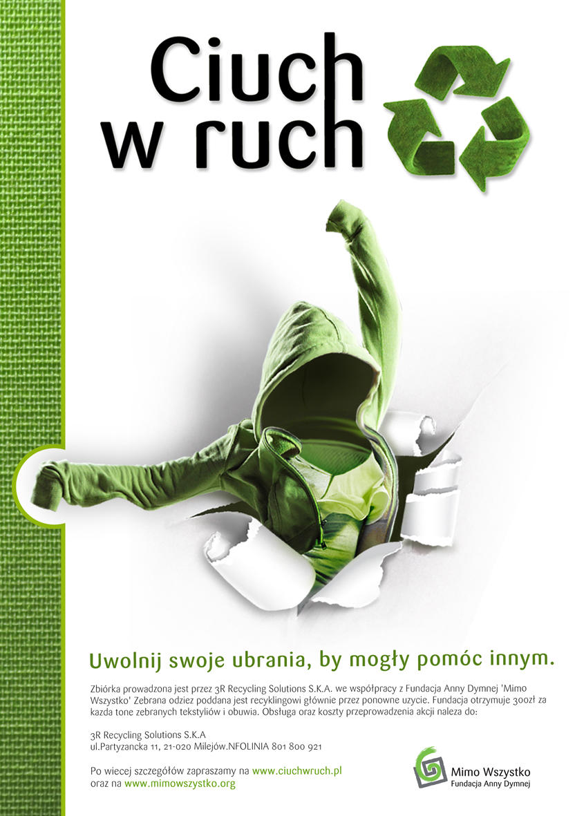 Ogólnopolska akcja CIUCH W RUCH udowadnia, że nawet pozornie bezużyteczny przedmiot w istocie ma swoją wartość. Celem programu jest mądre wykorzystanie nikomu nieprzydatnych ubrań tak, aby materiał, z którego zostały wykonane, został ponownie wykorzystany, a więc poddany szeroko rozumianemu recyclingowi. Co więcej, część zysku pozyskanego ze zbiórki ubrań zostanie przekazana na rzecz podopiecznych fundacji Anny Dymnej Mimo Wszystko.