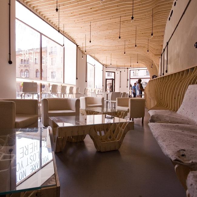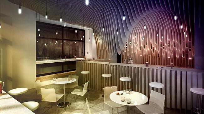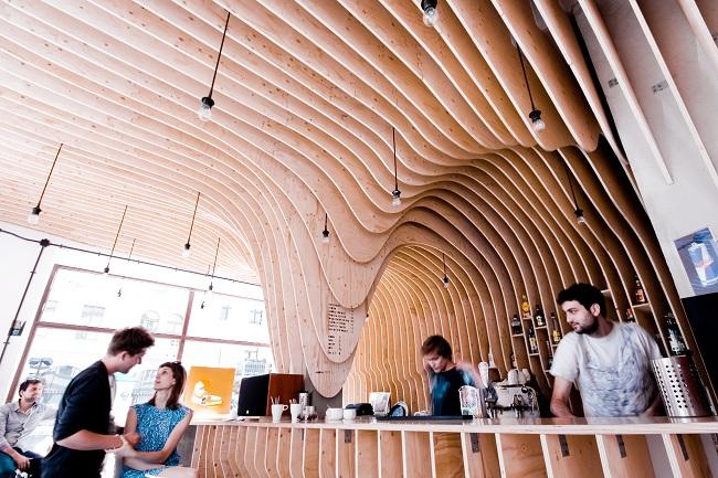 Stalaktyty z drewna zwisające z sufitu nad barem. Żarówki umieszczono pomiędzy zakrzywionymi belkami ze sklejki.