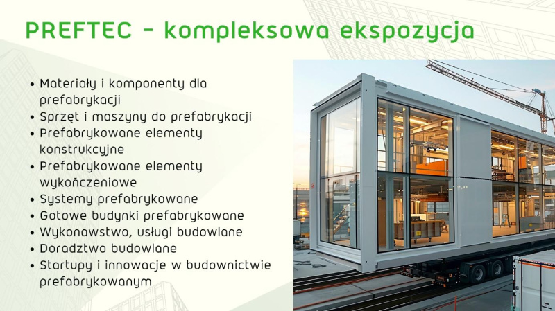 Odwiedzający będą mieli okazję zapoznać się z innowacjami w prefabrykacji, w tym startupami, nowymi materiałami i komponentami, a także nowoczesnymi maszynami i sprzętem wykorzystywanym w tej technologii. Wśród prezentowanych rozwiązań znajdą się prefabrykowane elementy wykończeniowe, systemy budowlane, gotowe budynki modułowe oraz usługi budowlane i doradztwo.