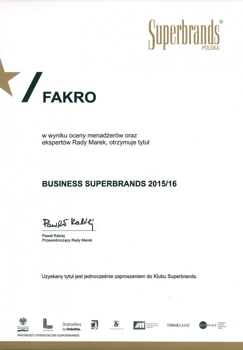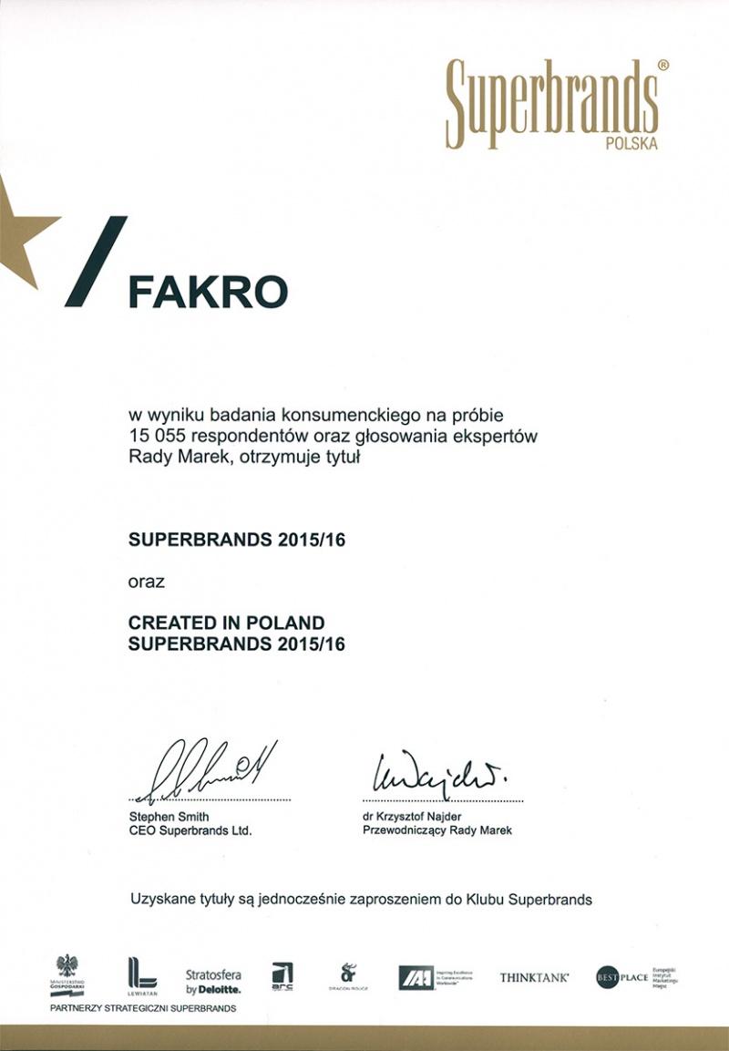 Firma FAKRO, wicelider światowego rynku okien dachowych została uznana za jedną z najsilniejszych marek na polskim rynku. Firma FAKRO otrzymała tytuł Superbrands 2015/16 i Created in Poland Superbrands 2015/16. Dodatkowo została wyróżniona tytułem Business Superbrands 2015/16.