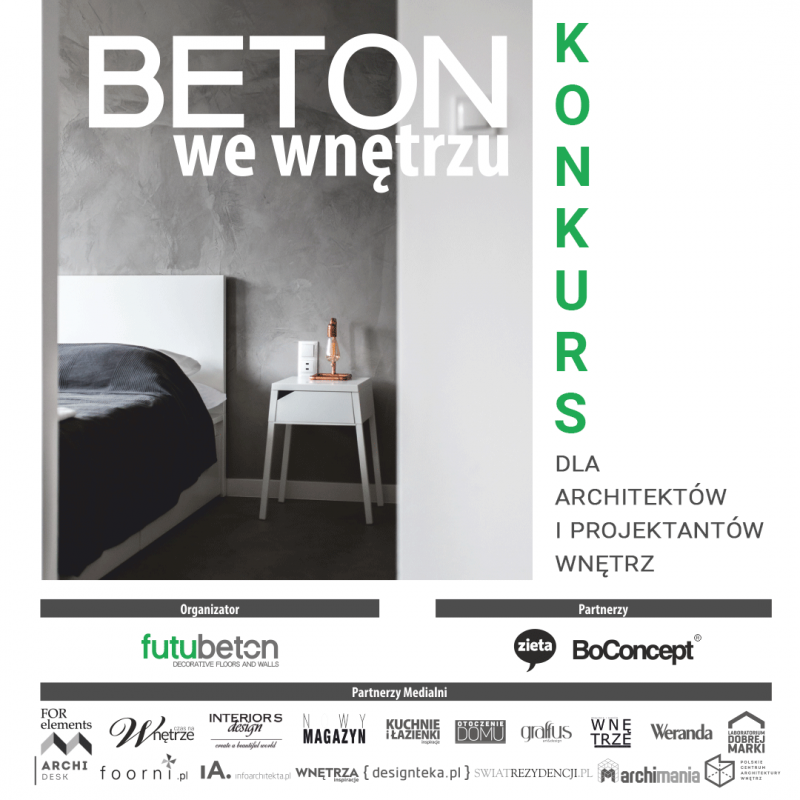 Celem konkursu jest wyłonienie najciekawszych koncepcji wnętrz mieszkalnych lub obiektów publicznych z wykorzystaniem produktów marek Futu Beton, Zięta Prozessdesign oraz BoConcept w projektowanych wnętrzach. Bogaty asortyment marek stwarza ku temu wyjątkowe możliwości, a wyzwanie jest tym ciekawsze, że projekt dotyczy zarówno wnętrz mieszkalnych jak też publicznych. Szukamy takich sposobów zastosowania betonu marki Futu Beton, które będą nie tylko praktycznym rozwiązaniem, ale też oryginalną, autorską wizją. Produkty z oferty naszych Partnerów dodatkowo nadadzą wyjątkowego charakteru każdemu wnętrzu. Zwycięzcy konkursu otrzymają nagrody i promocyjne wsparcie.