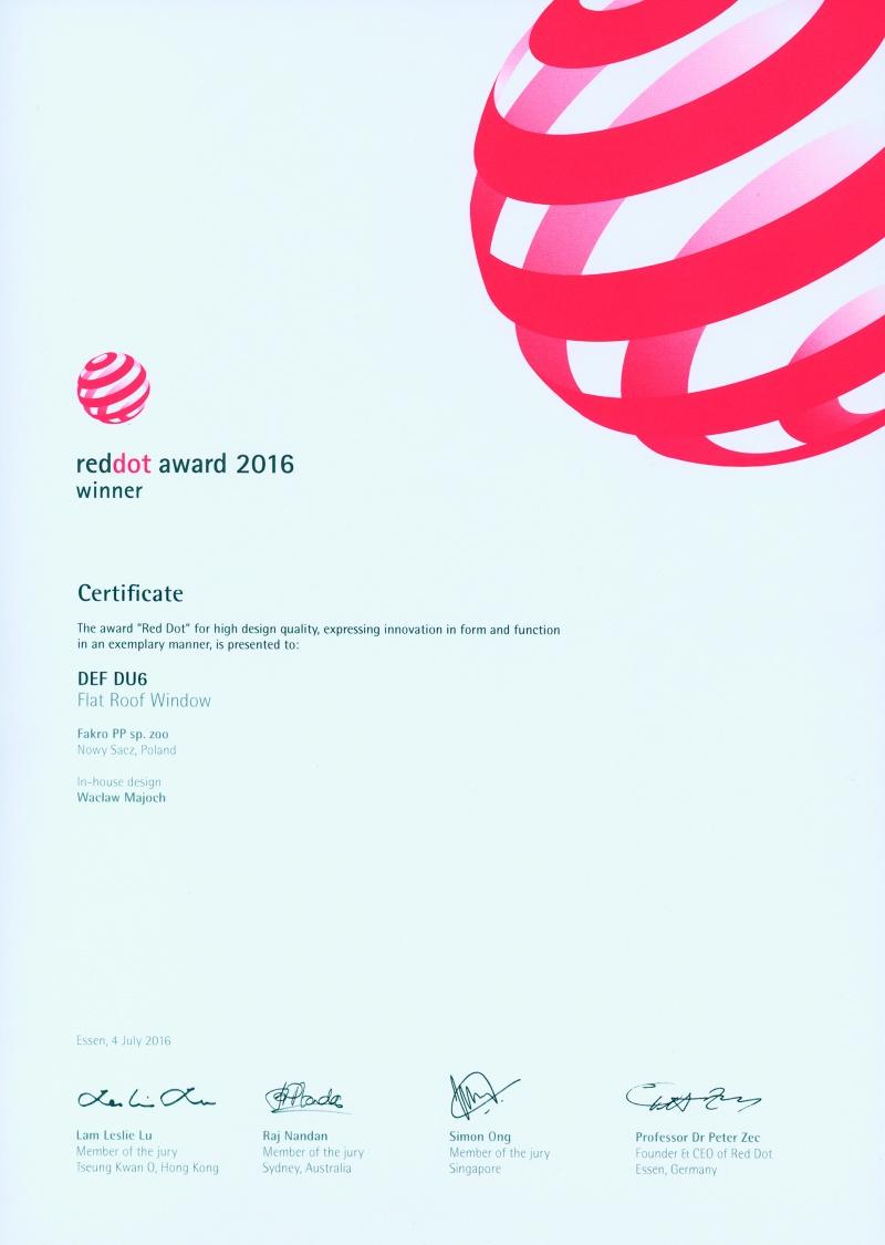 4 lipca br. w Aalto Theater w Essen odbyła się uroczysta gala wręczenia nagród Red Dot Design 2016. Jest to jedna z najbardziej prestiżowych nagród za design na świecie, która przyznawana jest co roku firmom wyznaczającym nowy kierunek rozwoju w dziedzinie wzornictwa. Międzynarodowe jury dokonujące wyboru składa się wybitnych osobistości. FAKRO, słynące z innowacyjnych, funkcjonalnych, ale także wyróżniających się wysoką estetyką produktów zostało wyróżnione tą prestiżową nagrodą. Trofeum, nazywanym „Oskarem designu”, otrzymało okno do dachów płaskich DEF DU6.
