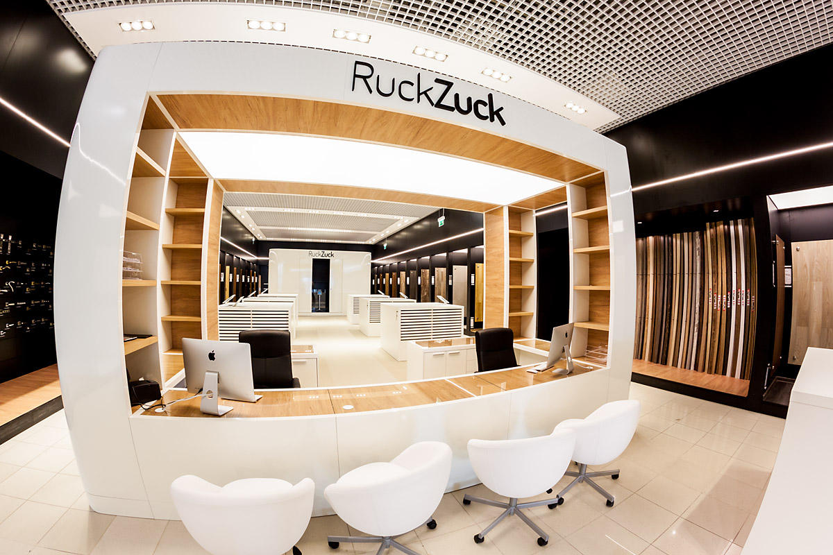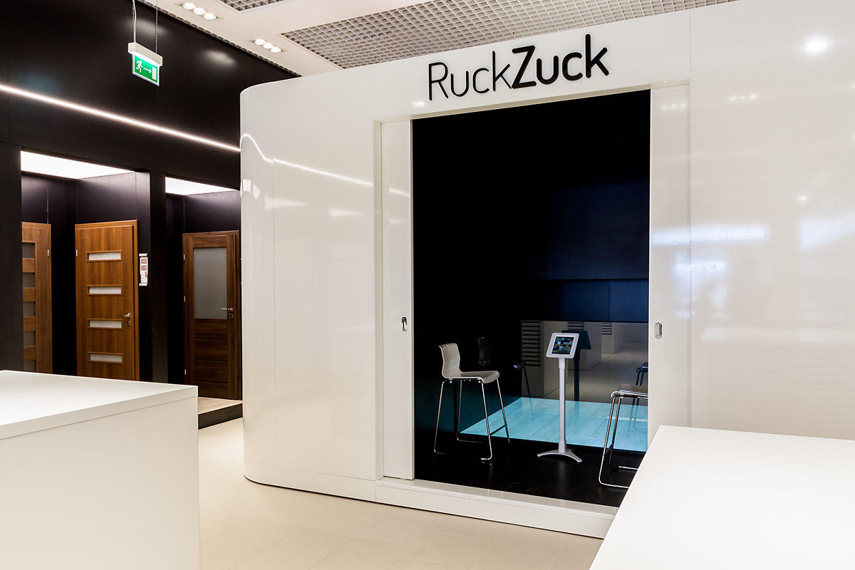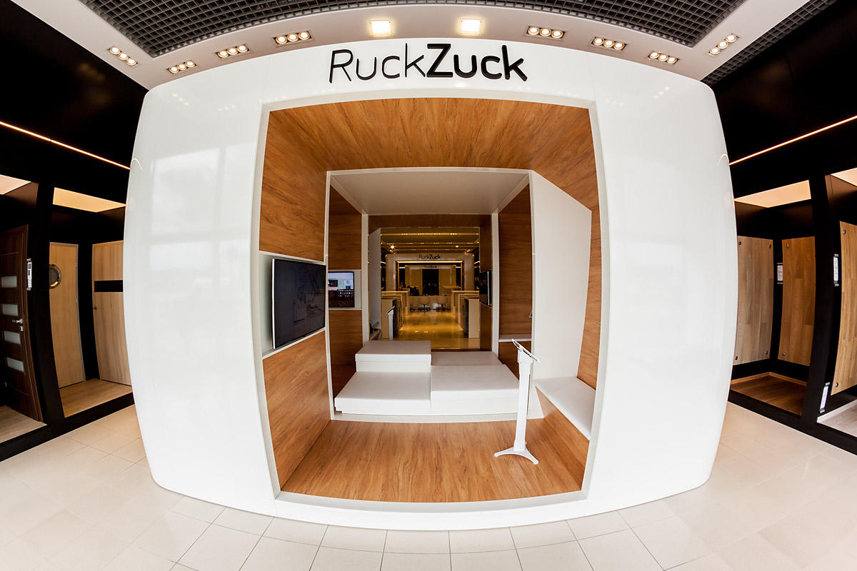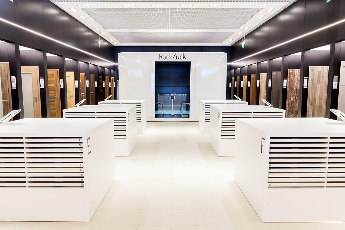 Nowy salon RuckZuck to designerski, zaprojektowany z dbałością o każdy detal sklep, na pierwszy rzut oka przypominający ekskluzywny showroom. Wnętrze zostało wyposażone w białe ekspozytory z wysuwanymi wzornikami podłóg, skórzane wygodne białe kanapy i telewizory plazmowe na ścianach. Skrzydła drzwiowe zostały wyeksponowane w czarnych, matowych i podświetlanych boksach, a wnętrza stanowisk z multimedialnymi konfiguratorami zdobione kolorem miodowego drewna. Za projekt sklepu odpowiada uznana pracownia architektoniczna z Warszawy.