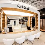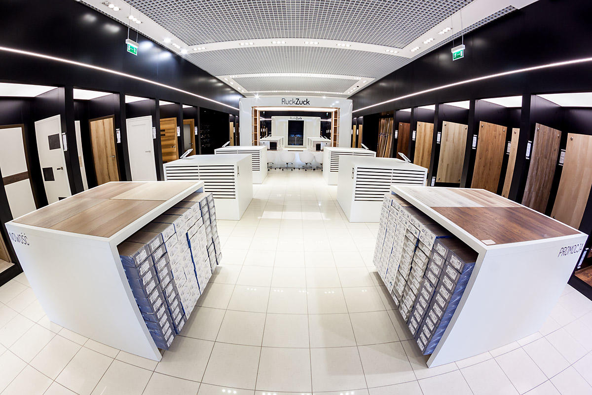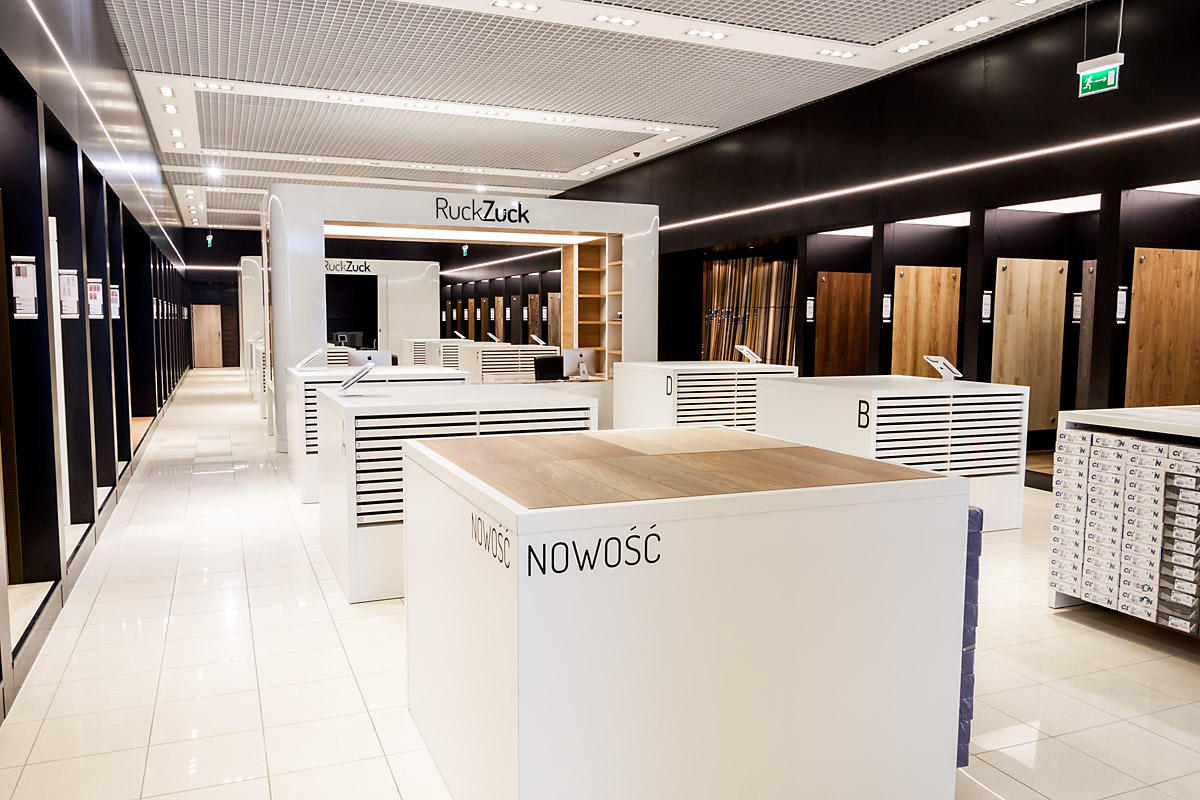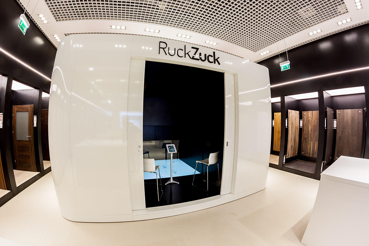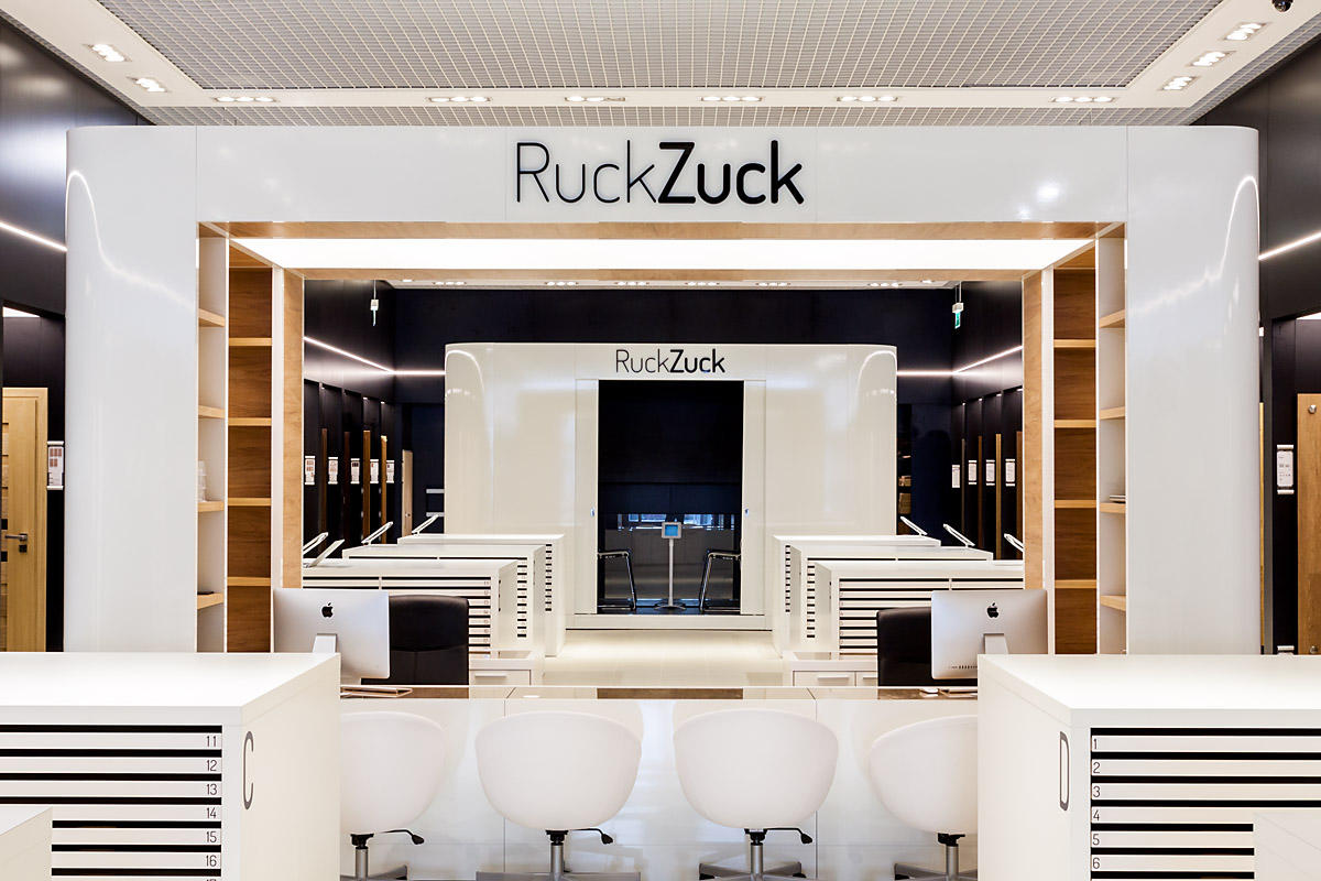 Nowy salon RuckZuck to designerski, zaprojektowany z dbałością o każdy detal sklep, na pierwszy rzut oka przypominający ekskluzywny showroom. Wnętrze zostało wyposażone w białe ekspozytory z wysuwanymi wzornikami podłóg, skórzane wygodne białe kanapy i telewizory plazmowe na ścianach. Skrzydła drzwiowe zostały wyeksponowane w czarnych, matowych i podświetlanych boksach, a wnętrza stanowisk z multimedialnymi konfiguratorami zdobione kolorem miodowego drewna. Za projekt sklepu odpowiada uznana pracownia architektoniczna z Warszawy.